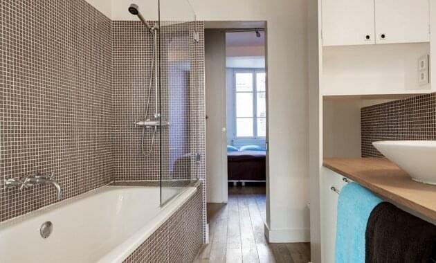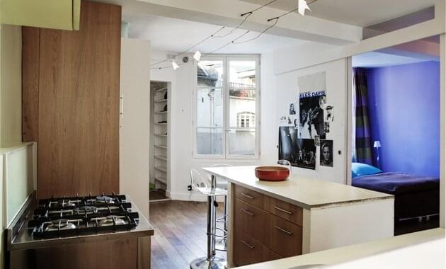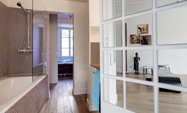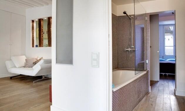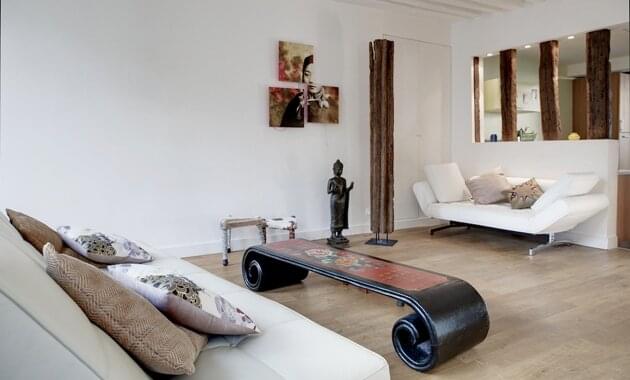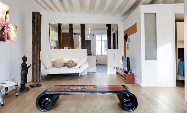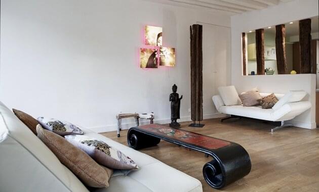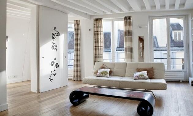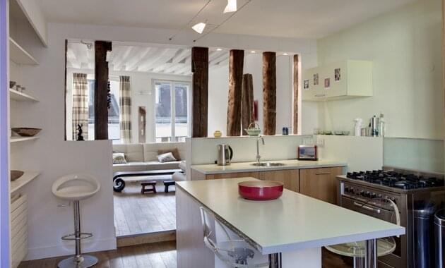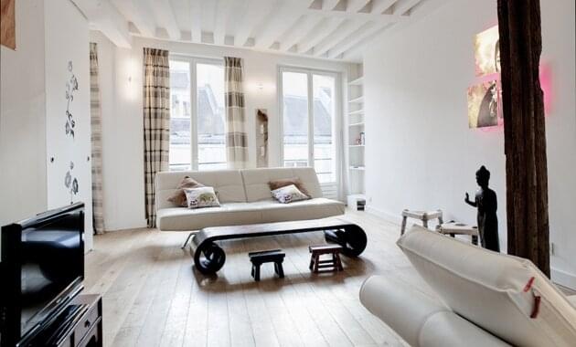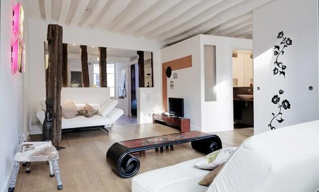 Discover the lively Marais district of Paris with a stay in Apartment Hotel de Ville on rue du Bourg Tibourg. This apartment is located in the heart of this trendy neighborhood offering numerous bars, restaurants, art galleries, and specialty boutiques, all situated on picturesque streets and alleyways. Many museums are also a short distance from the apartment, including the Carnavalet, the house of Victor Hugo, the Picasso National Museum, as well as the cultural center Georges Pompidou. Relax in the warm ambiance of this typical Parisian loft. Luminous spaces are accented with comfortable furnishings, soft pastel colors, and rustic wooden beams.