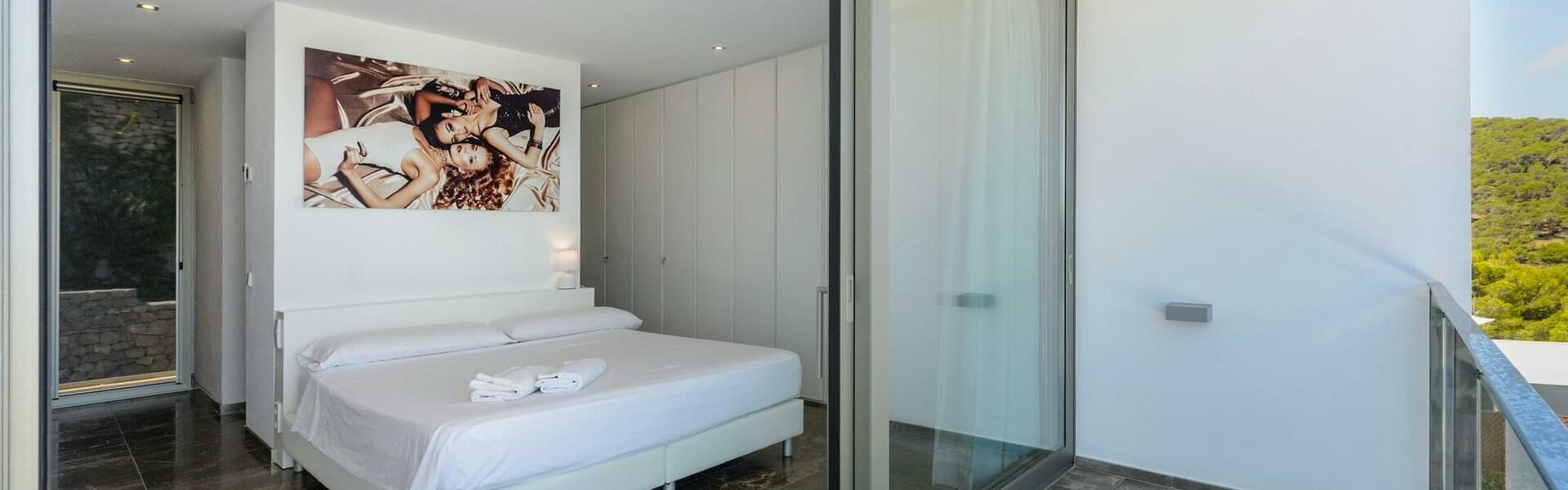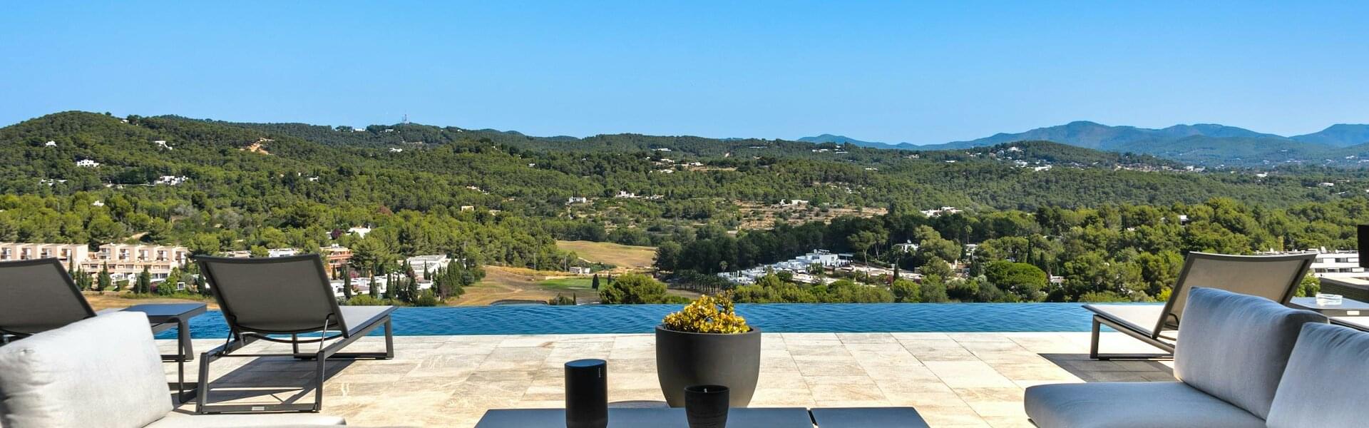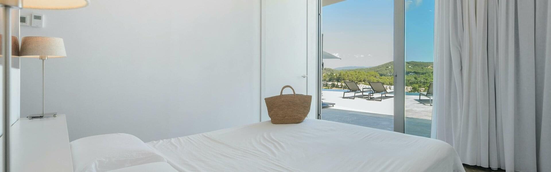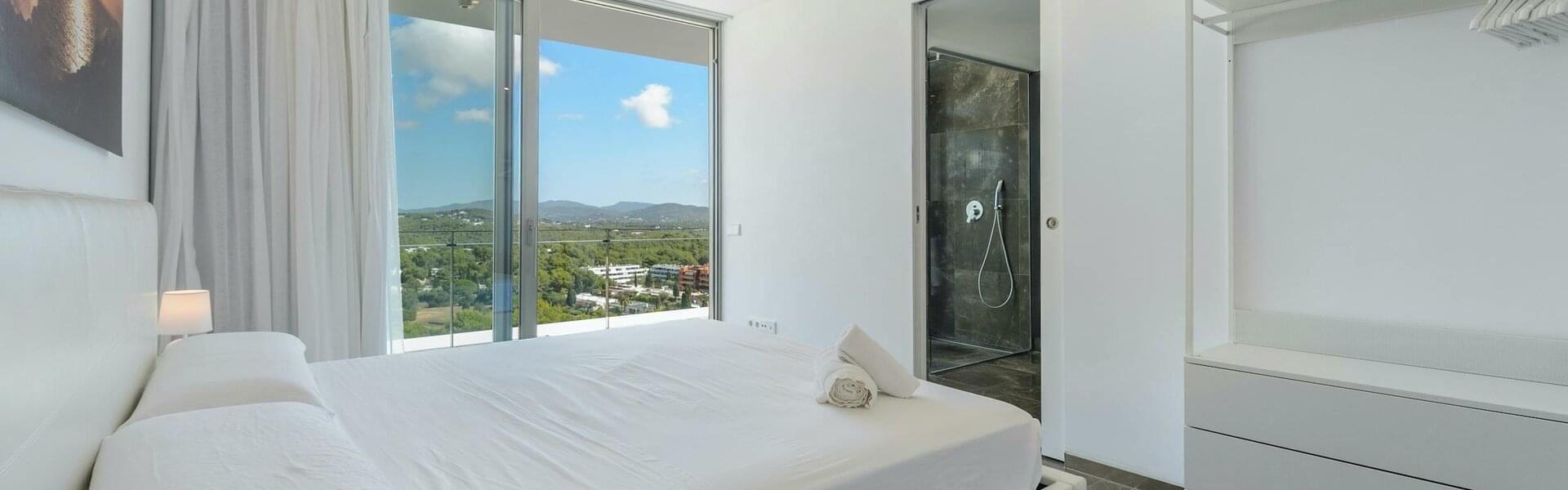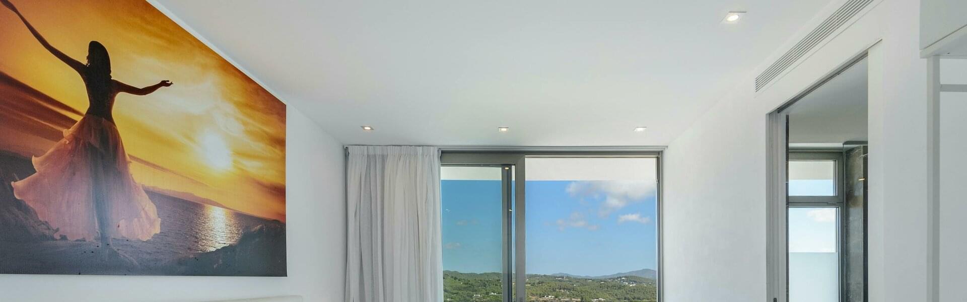 There’s also a cool chill-out space beside the pool, where L-shaped sofa seating has been placed to make the most of the magnificent views. This is a wonderful spot to welcome the sunrise or enjoy a colourful Ibizan sunset.