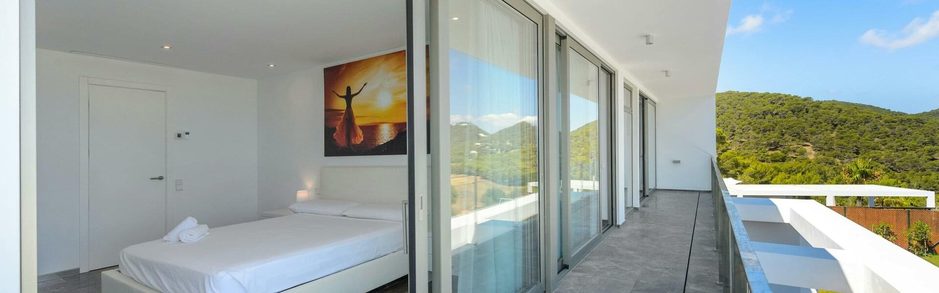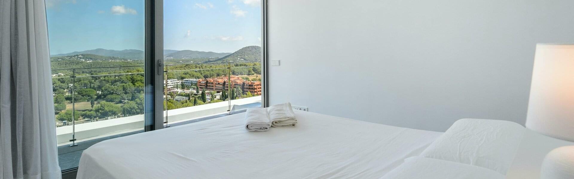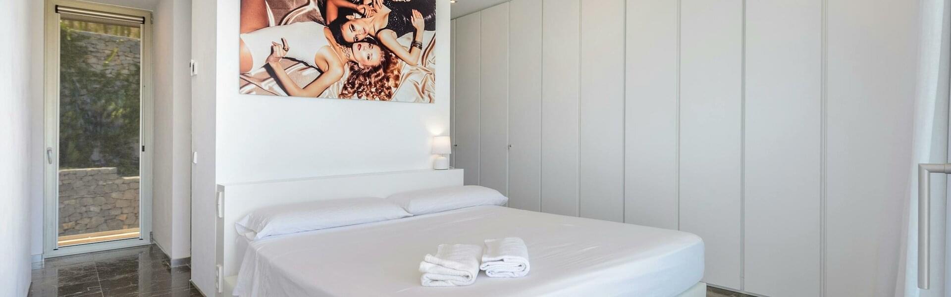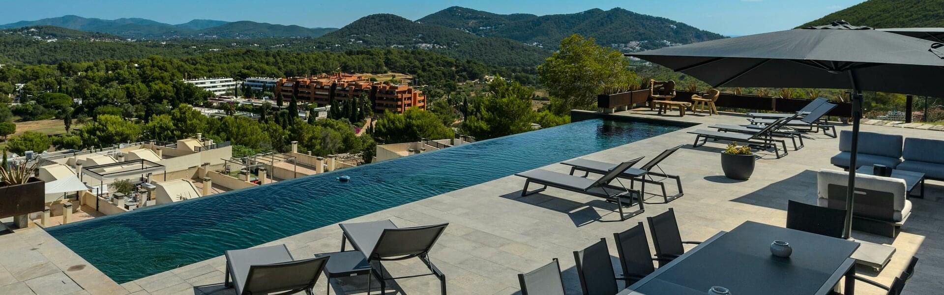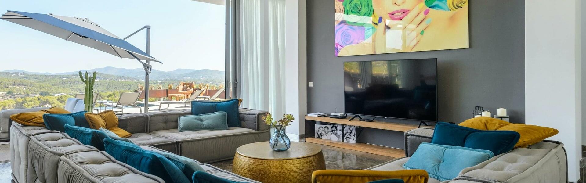 There’s also a cool chill-out space beside the pool, where L-shaped sofa seating has been placed to make the most of the magnificent views. This is a wonderful spot to welcome the sunrise or enjoy a colourful Ibizan sunset.