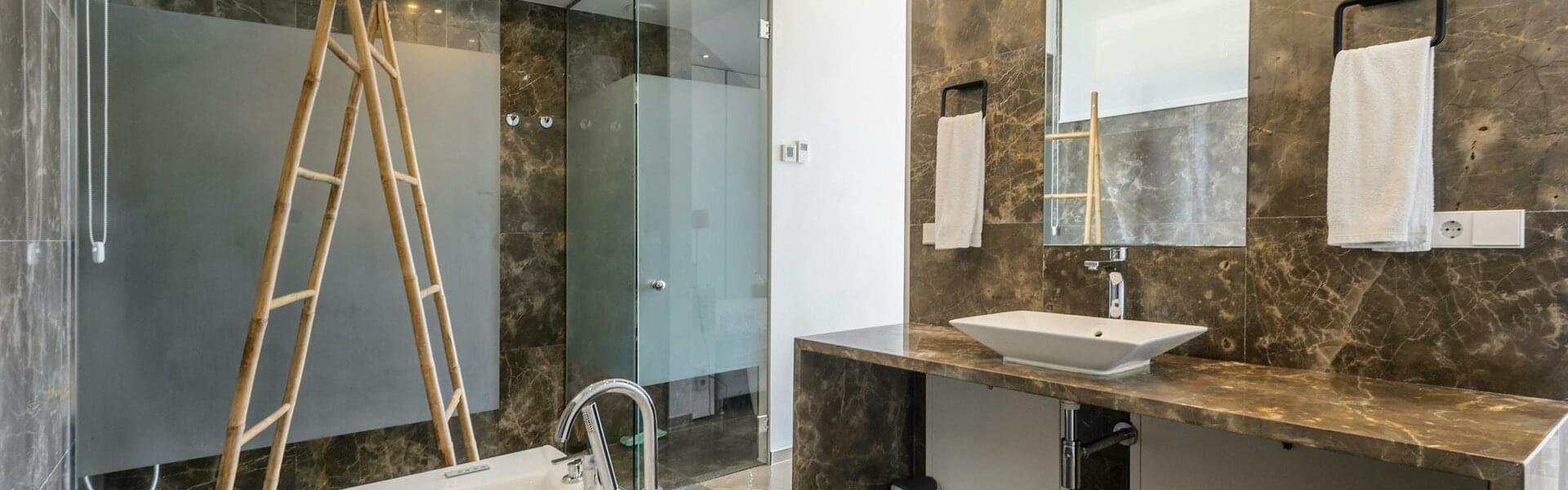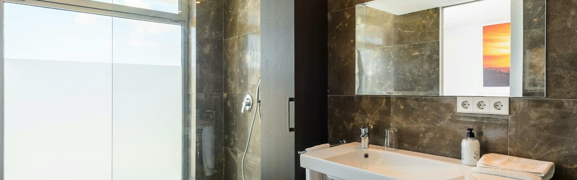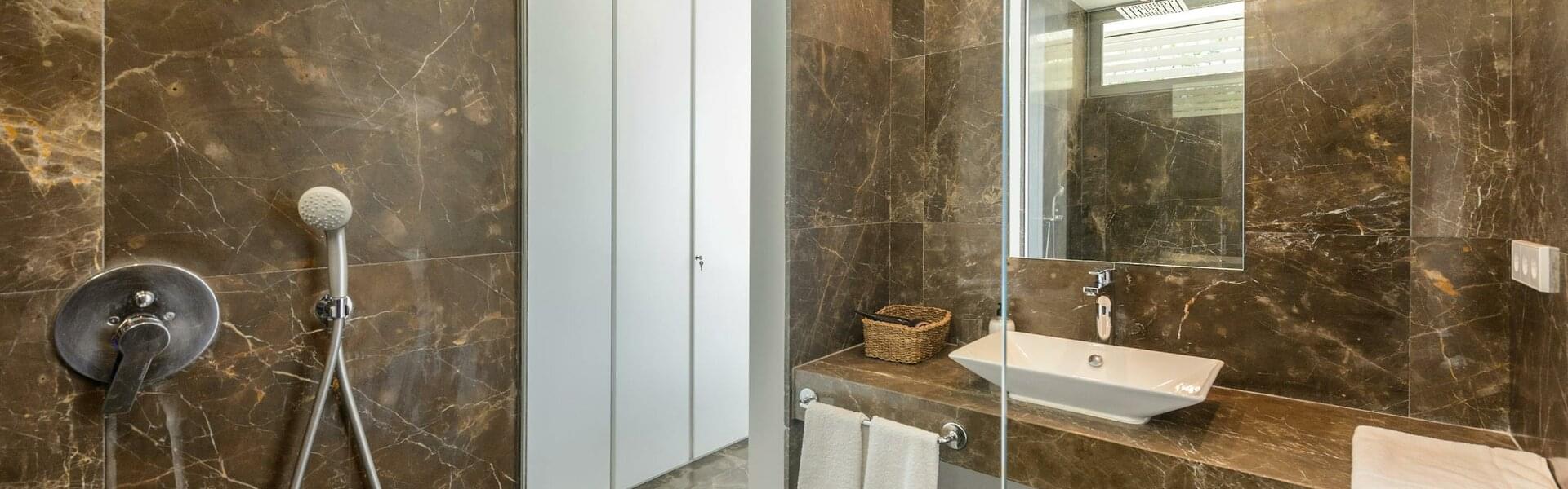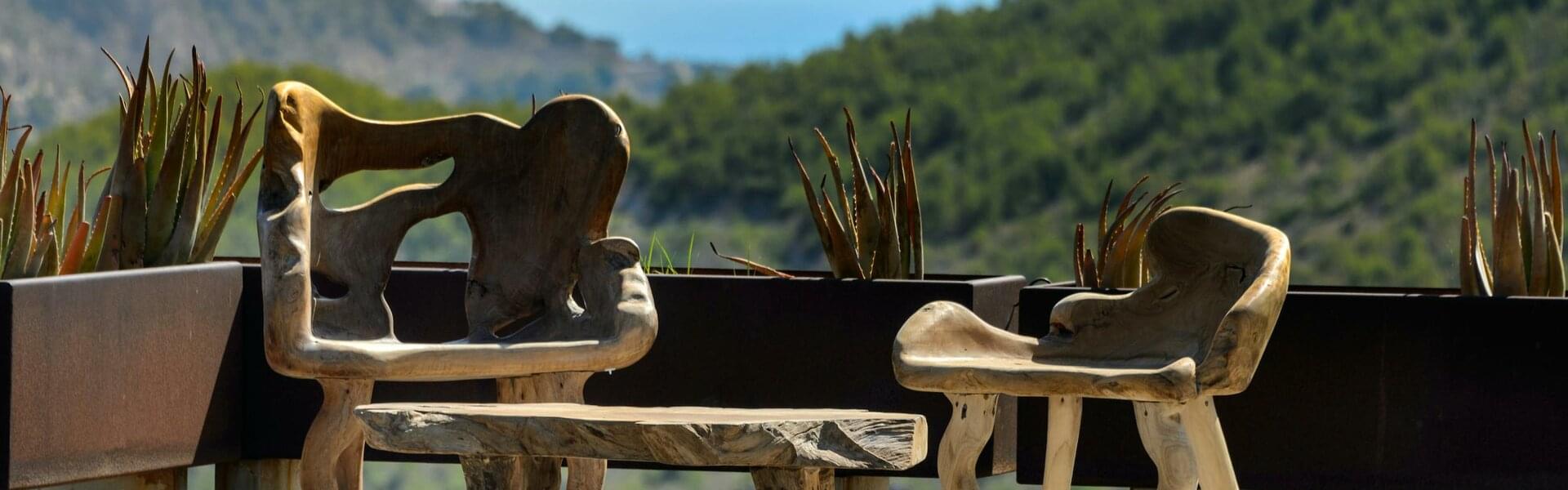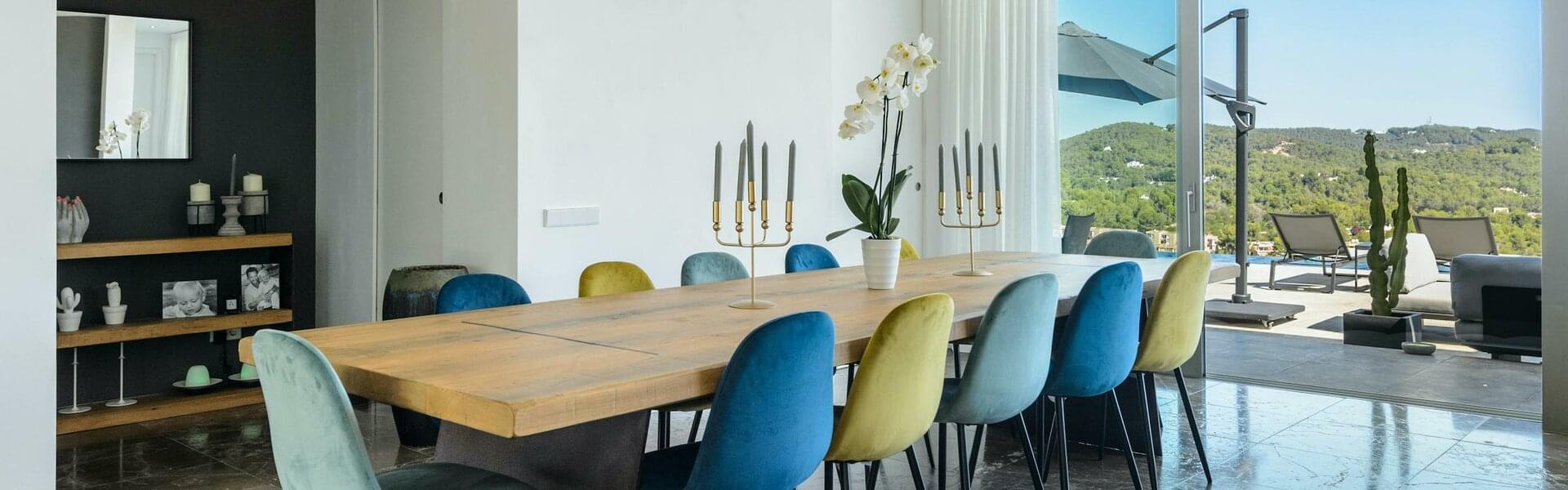 There’s also a cool chill-out space beside the pool, where L-shaped sofa seating has been placed to make the most of the magnificent views. This is a wonderful spot to welcome the sunrise or enjoy a colourful Ibizan sunset.