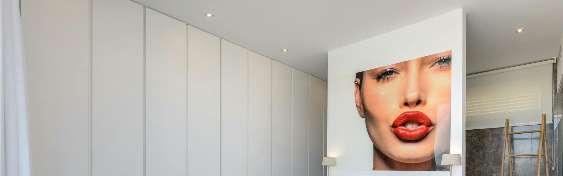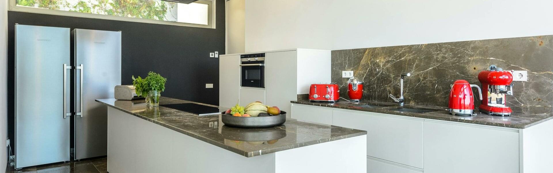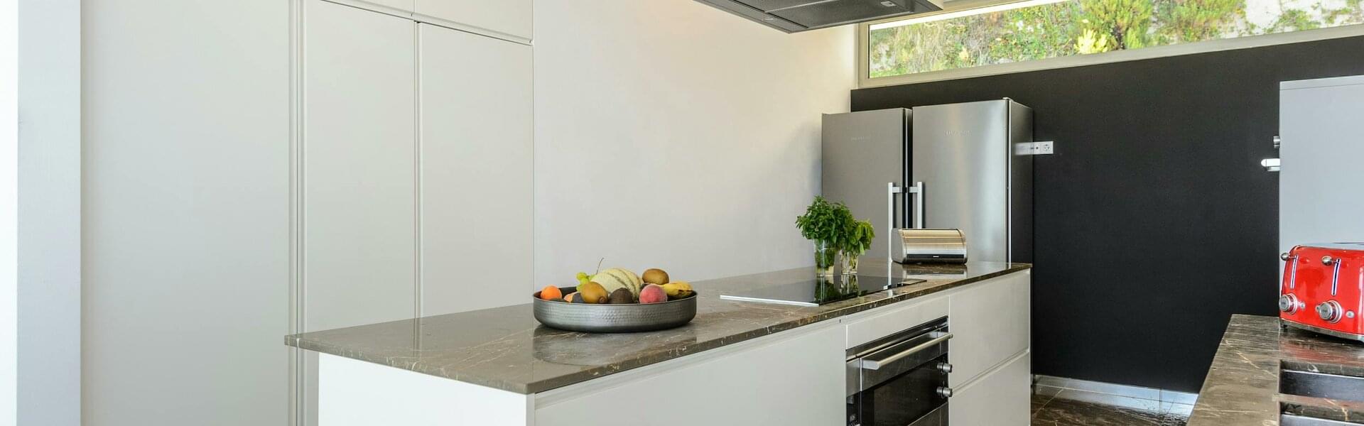 In the main living area, you’ll find a formal dining table in cool white, seating twelve, and a vast bank of cool, white sofa seating overlooking the pool. At the far end of the space, a smart kitchen in glossy white and marble ensures you have everything you need to cater to your party during your holiday.
