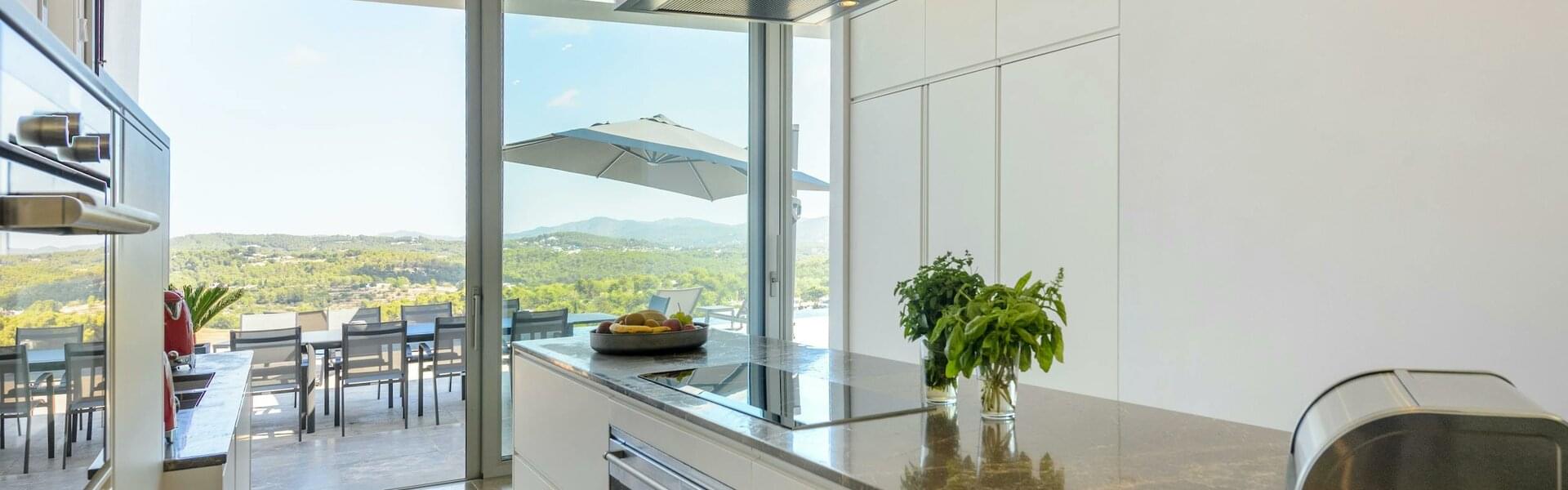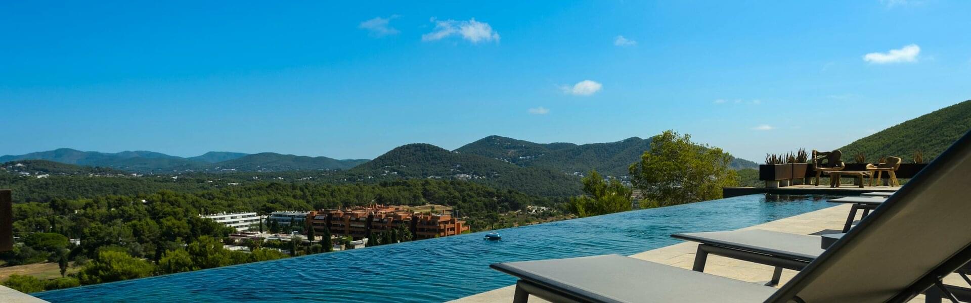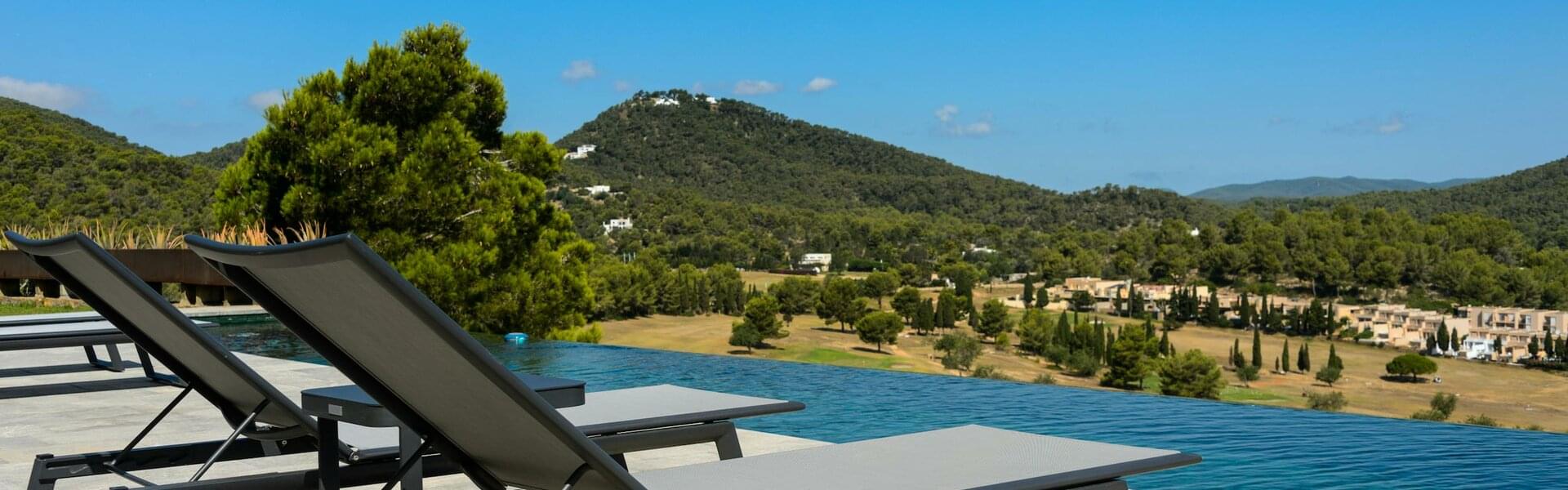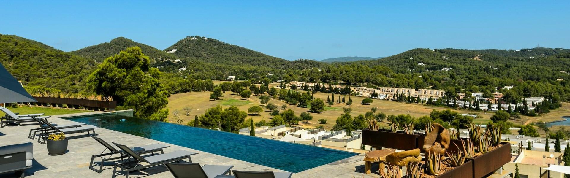 The angular white-rendered walls and vast sliding glass doors of Casa Isla Blanca are tucked into the back of the plot, so the wide pool terrace enjoys the best of the countryside views. It stretches out from the house to reveal a sparkling infinity pool.