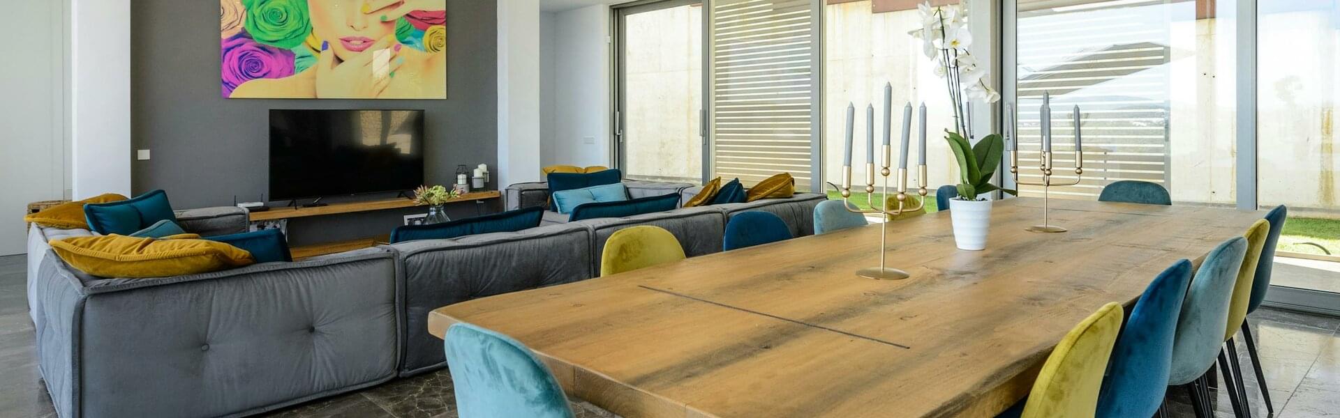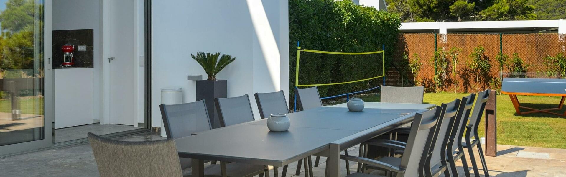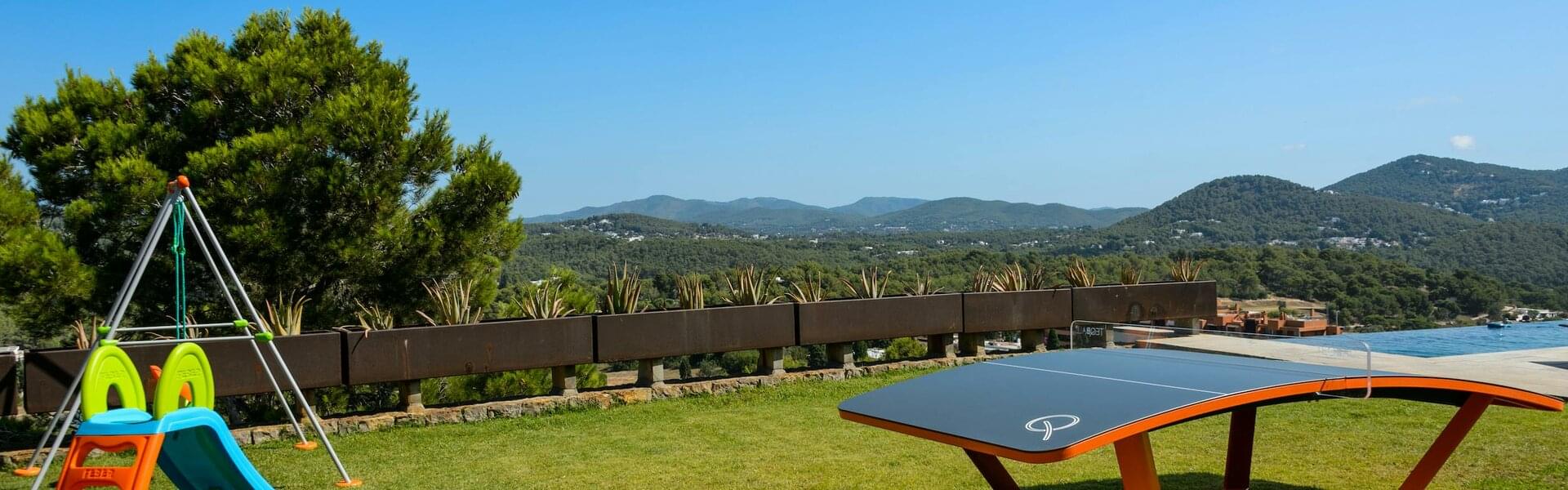 Here, you can relax on a lounger on this wide deck and soak up the warm Ibizan sunshine. Or enjoy a meal with friends at the large al-fresco dining table, seating fourteen. If you have children in your party, they’ll love playing on the manicured lawn beside the pool deck.