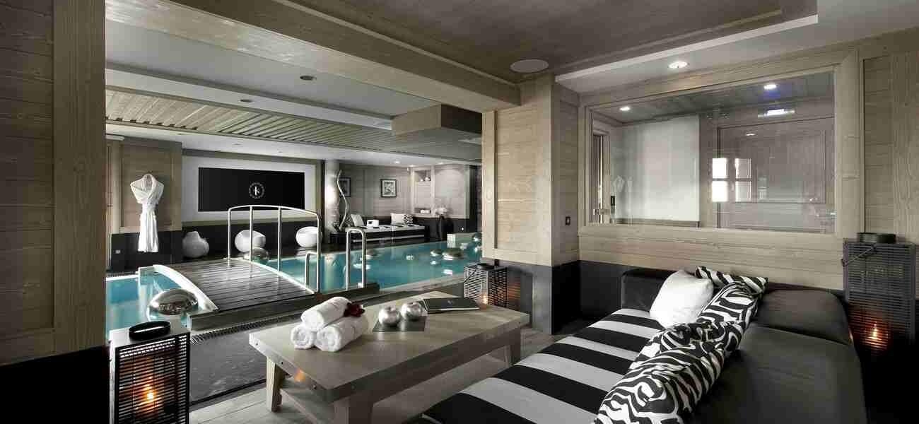Ski Room, Swimming pool with waterfalls and jacuzzi, hydrotherapy jets, lounge area, home Cinema, sauna, massage cabin, shower, Toilet, and Terrace.