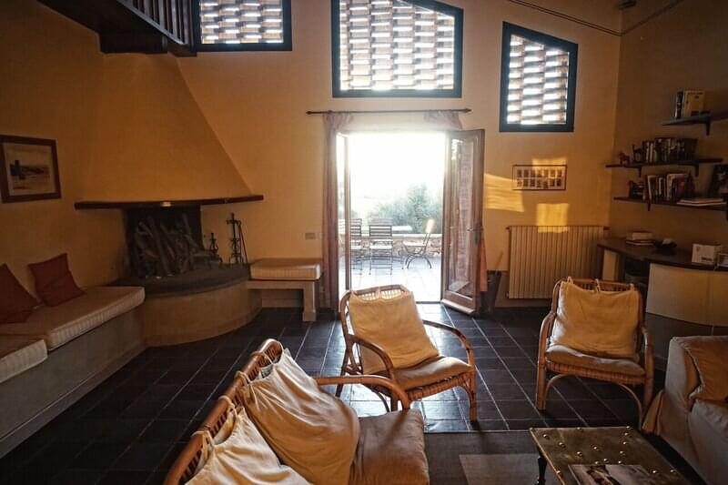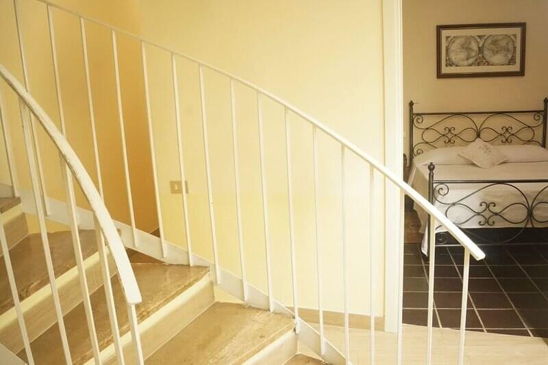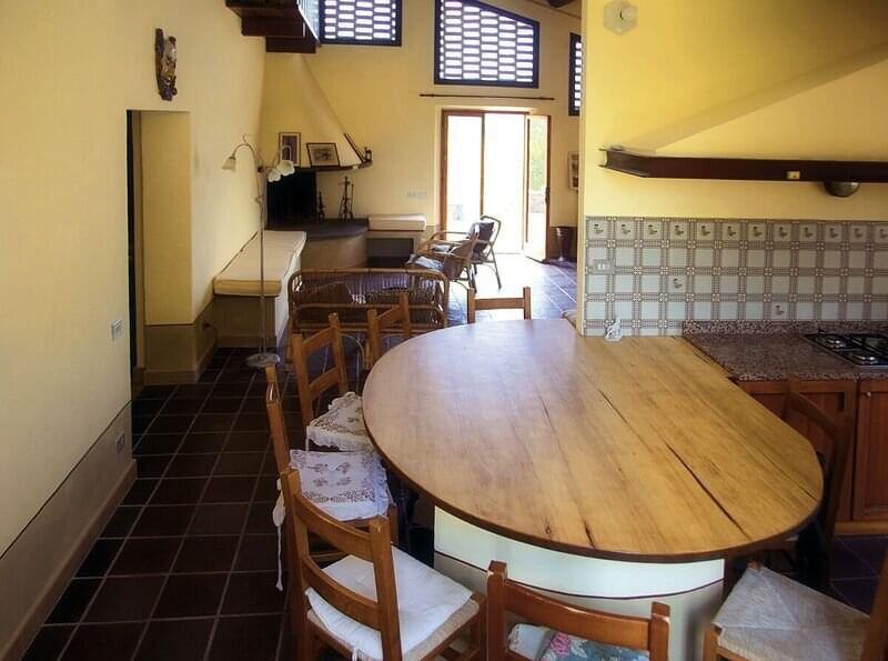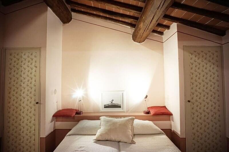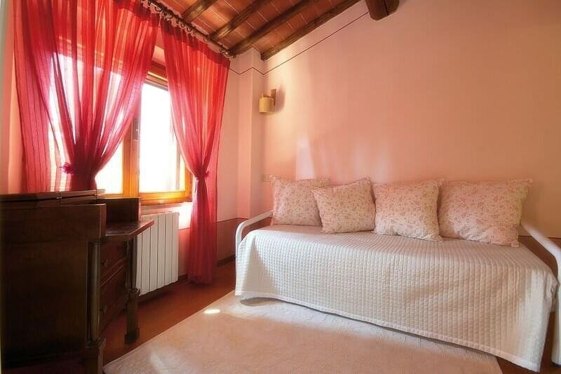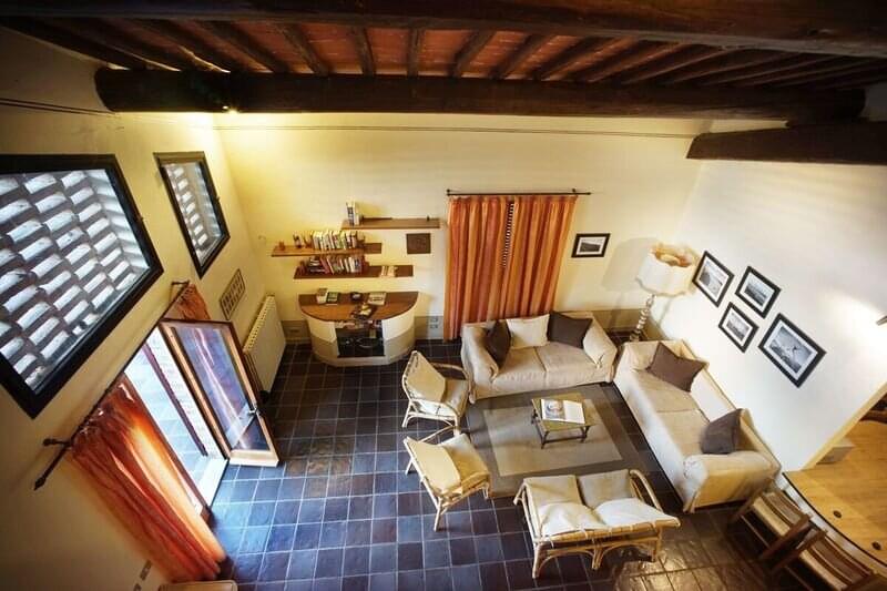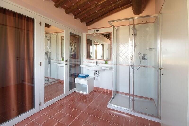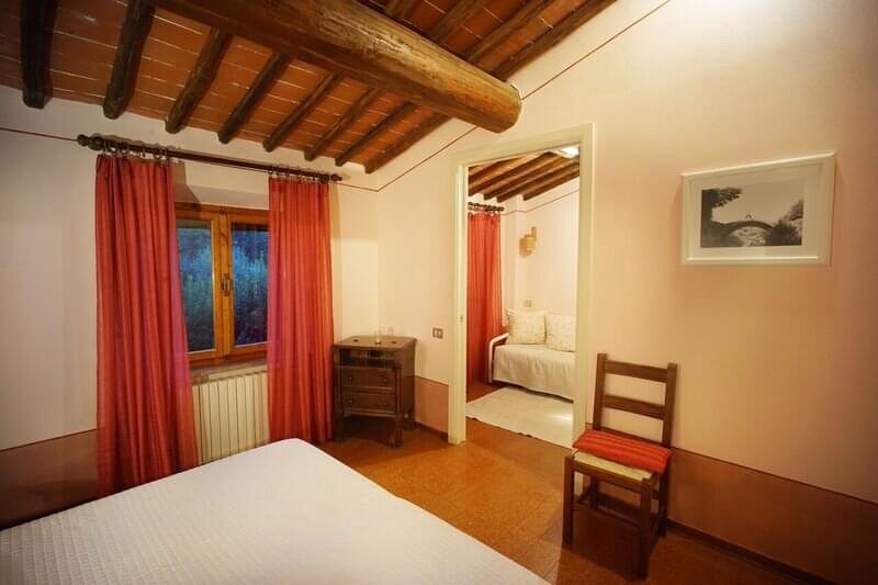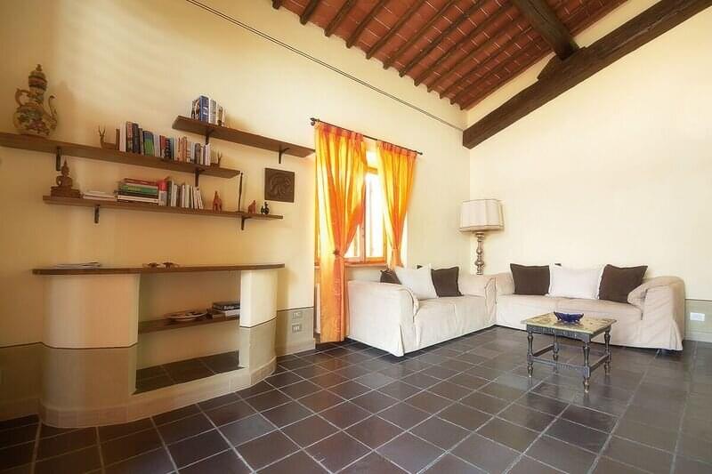 Il Cipresso has an open living/dining and kitchen area with double-height cassetone ceilings and a large hearth. Dining is at a large, round, built-in table or outdoors on the terrace. The tiled kitchen is equipped with a 6-burner gas stove, oven, fridge/freezer, dishwasher, double sinks, and doors opening to the garden. Downstairs, the bedrooms are arranged as: a queen with ensuite bath (tub and hand-held shower), a 2-twin room with ensuite bath with shower, and a studio with trundle bed, kitchenette and bathroom with shower. Upstairs has 2 queen bedrooms (one of them open to the living room below), a small bedroom with trundle bed, one full bathroom with tub and shower, and a shared half bathroom.