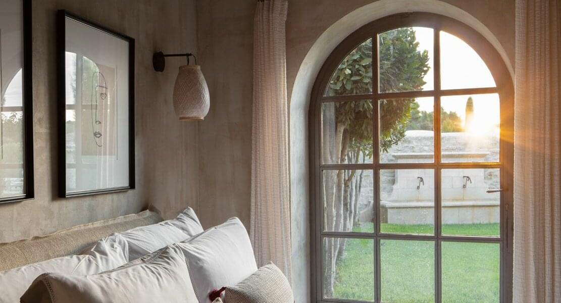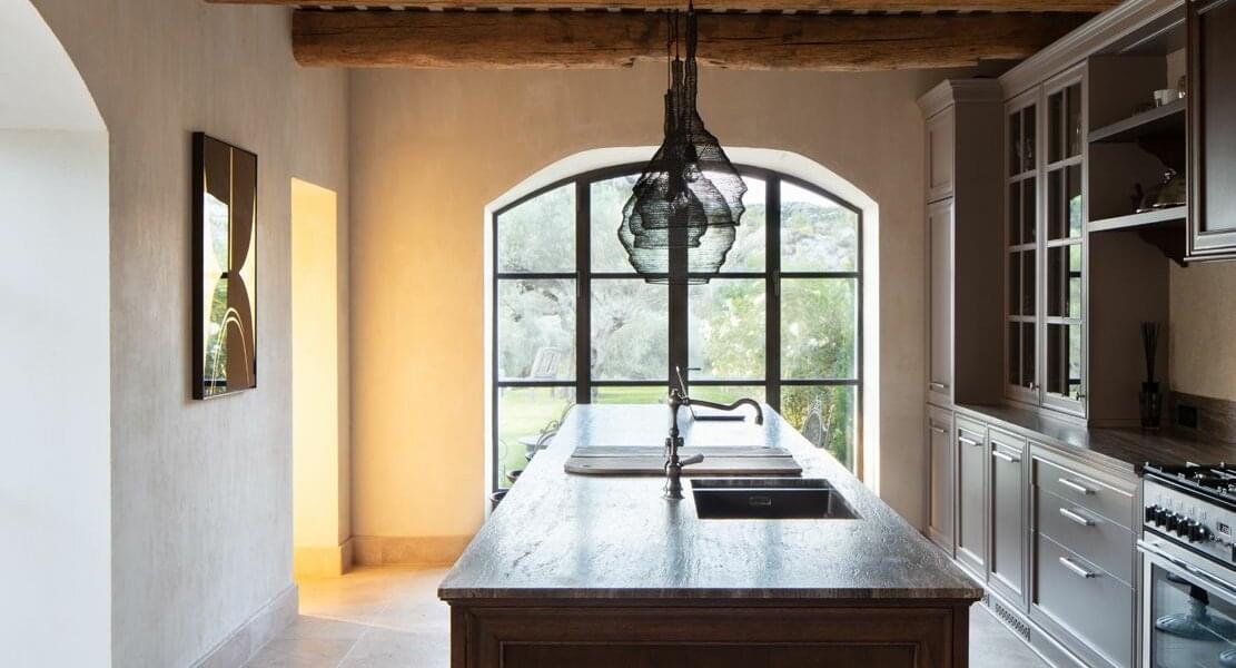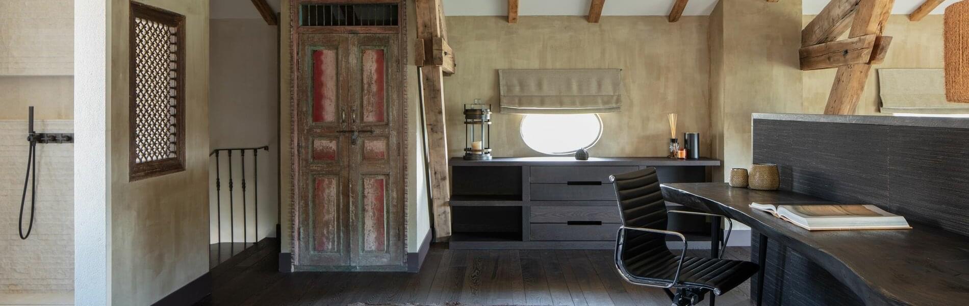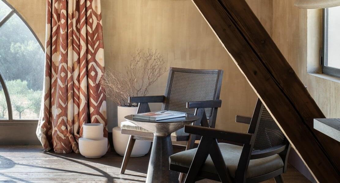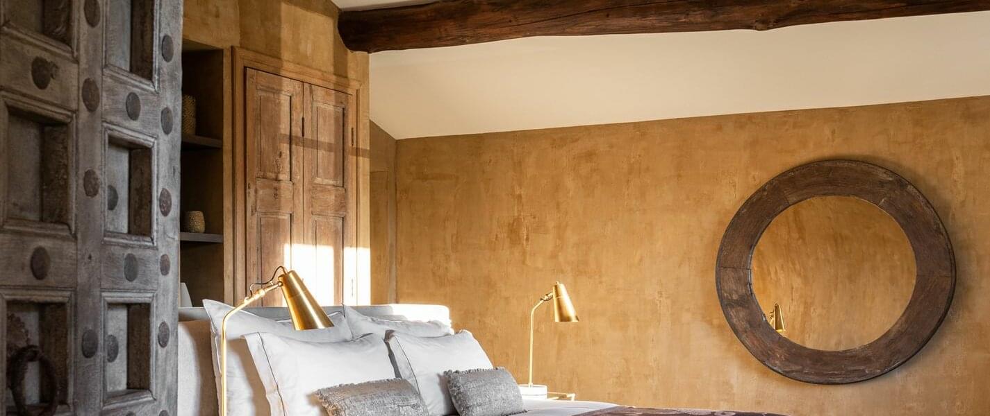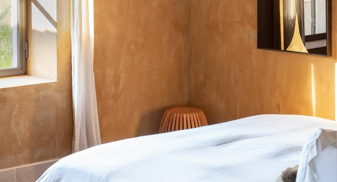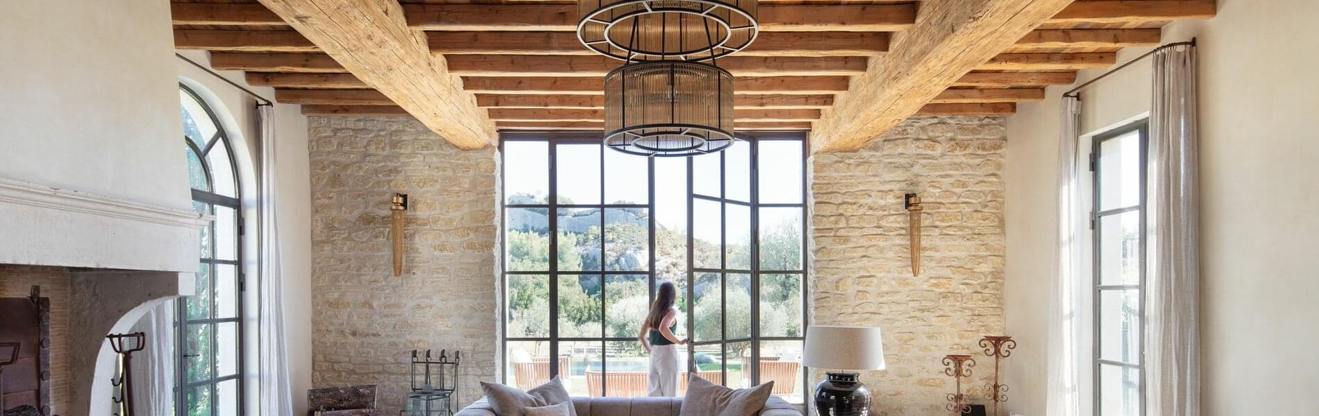 The interior decoration is in the image of the place, all in harmony and contrasts. Limestone slabs from Les Baux and dark oak parquet floors, joineries and ironwork of antique appearance on the stone facade, clay, sand, lime and vegetable pigments on the walls. The softness and curves of the upholstered sofas are balanced with the imposing stone fireplace in the living room, while aerial suspensions lighten the ceilings with exposed beams and joists.