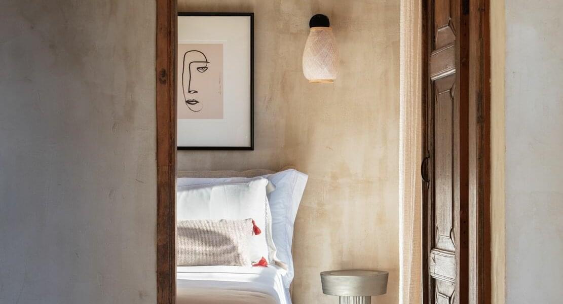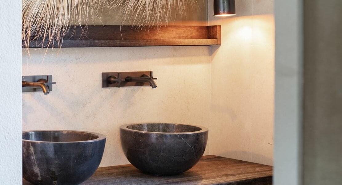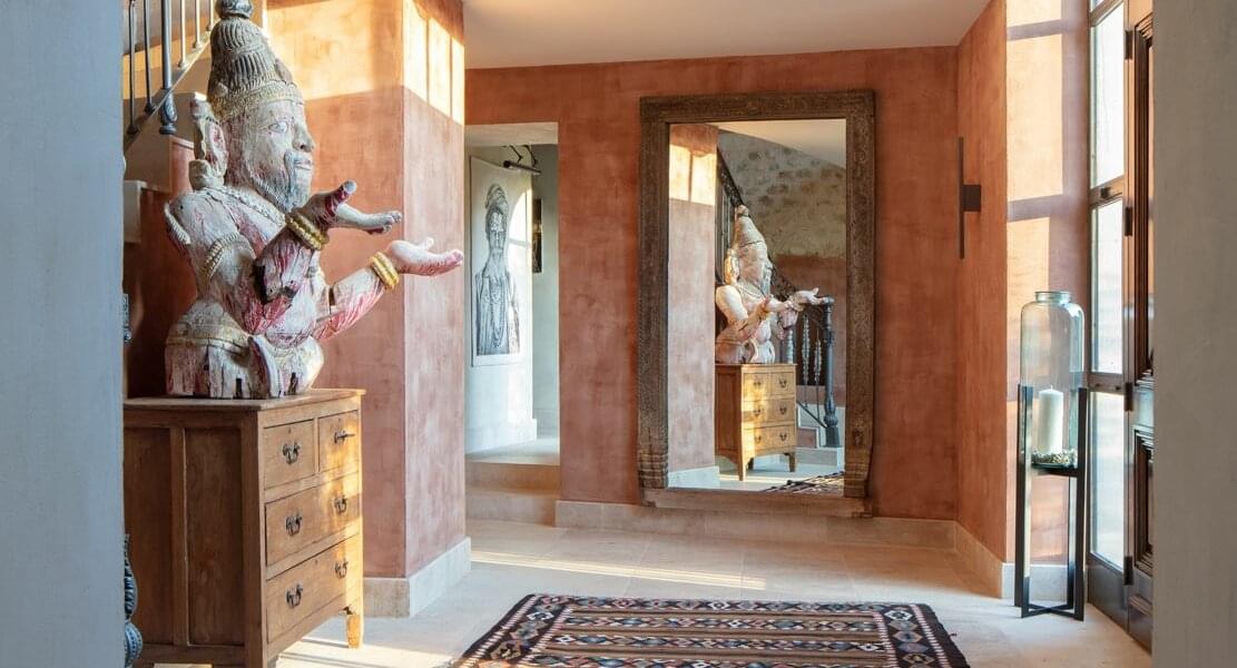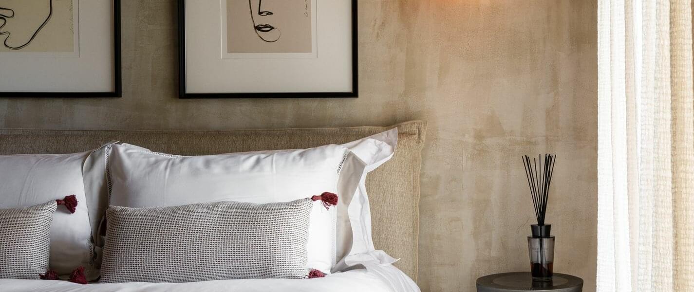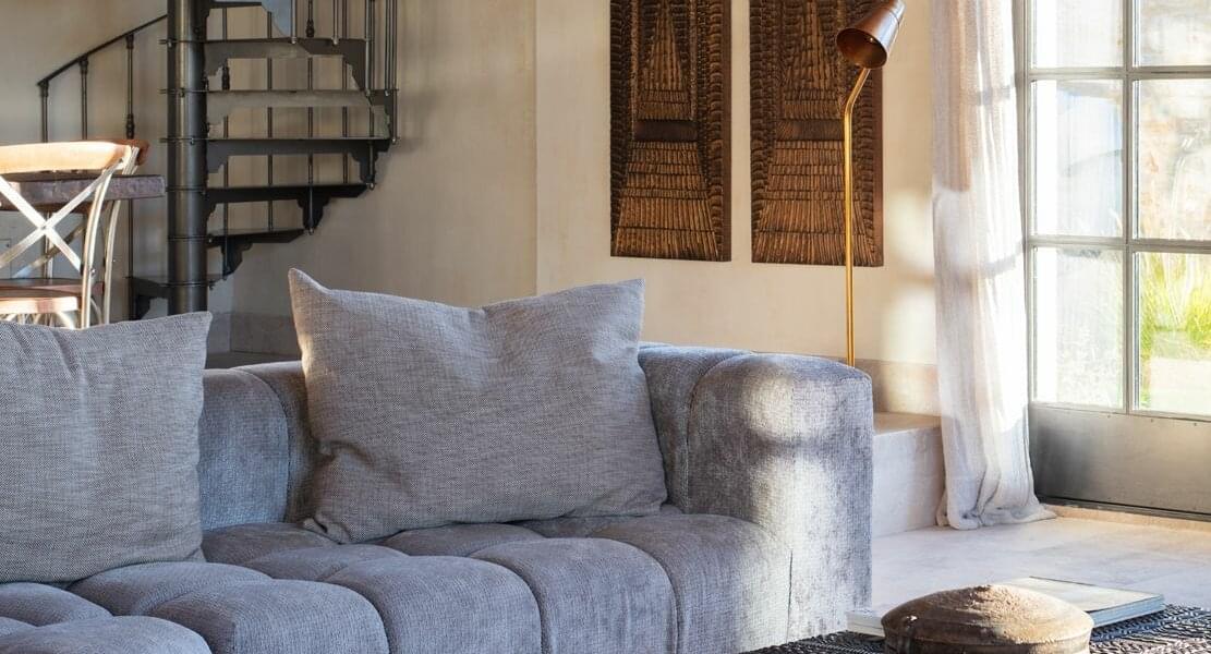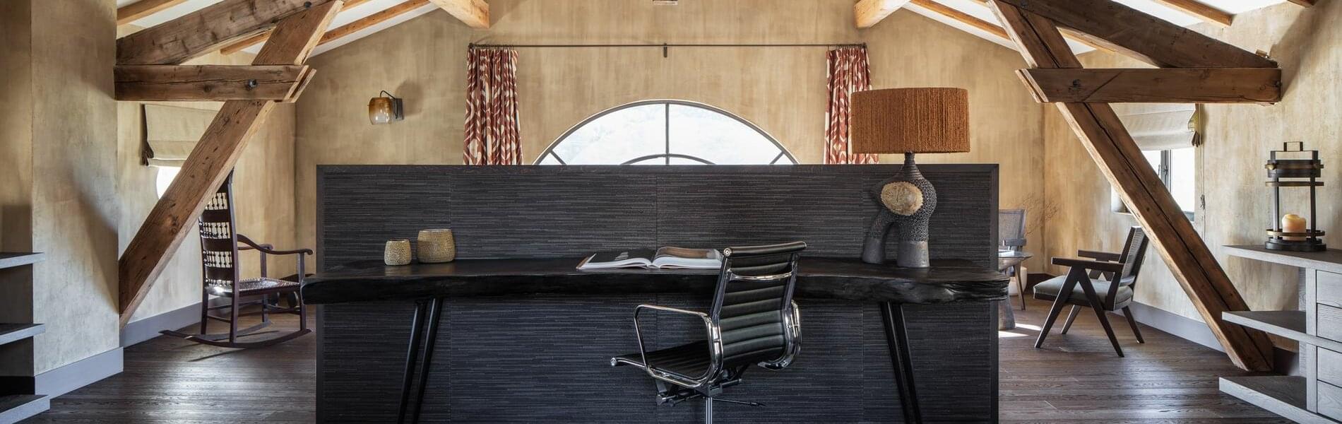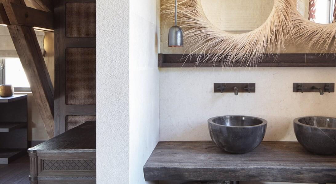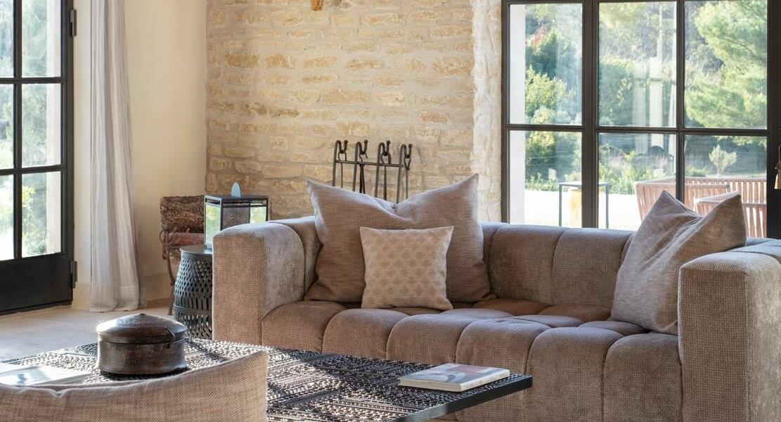 The interior decoration is in the image of the place, all in harmony and contrasts. Limestone slabs from Les Baux and dark oak parquet floors, joineries and ironwork of antique appearance on the stone facade, clay, sand, lime and vegetable pigments on the walls. The softness and curves of the upholstered sofas are balanced with the imposing stone fireplace in the living room, while aerial suspensions lighten the ceilings with exposed beams and joists.