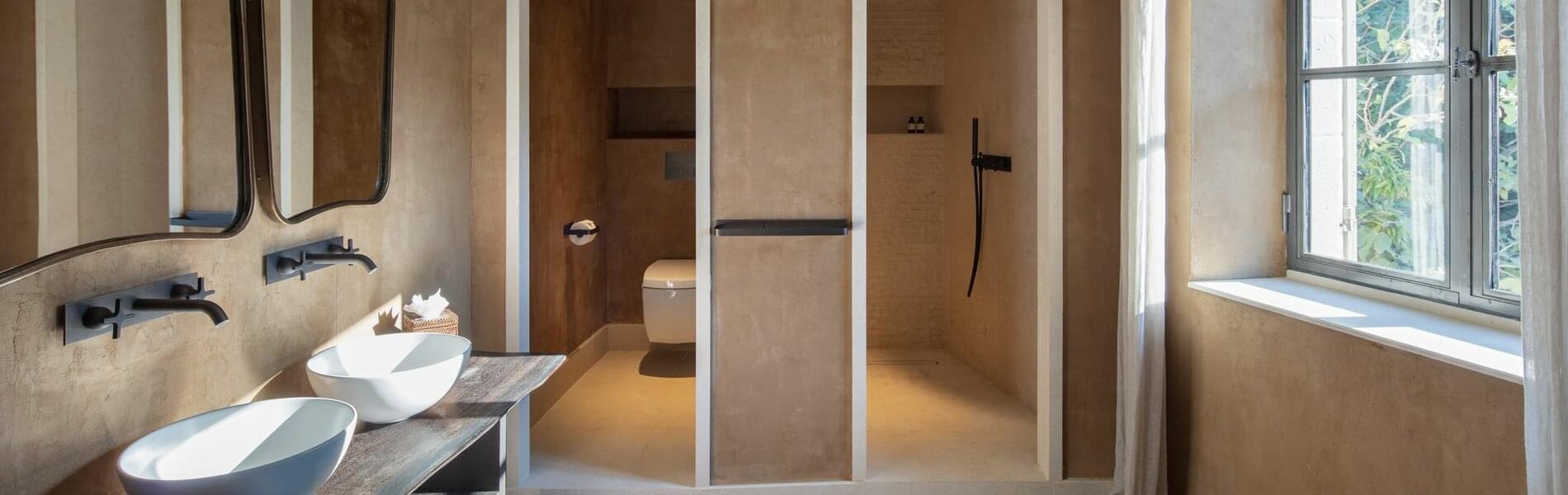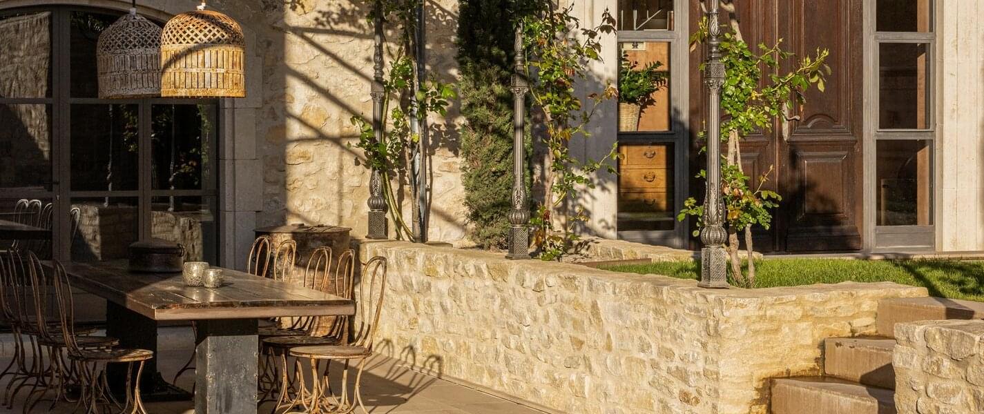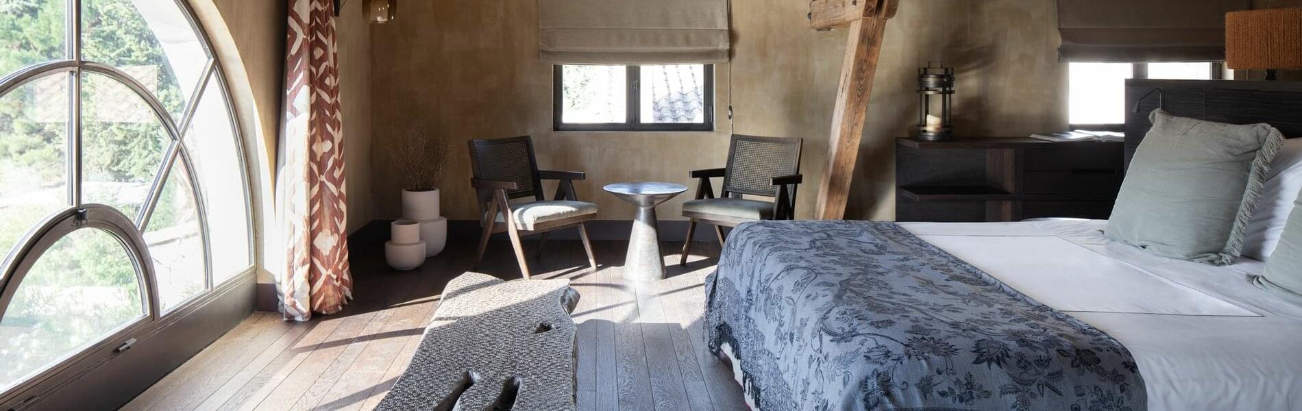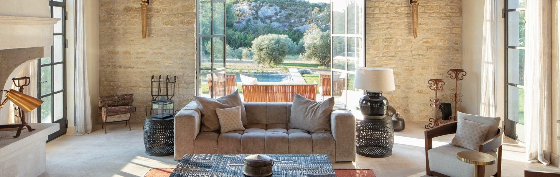 On the ground floor of the Bastide, the large living room of 80 sqm with its high bay windows opening onto the terrace and the swimming pool, its massive stone fireplace, its cozy sofas, colorful carpets and antique furniture found in flea markets. Overhanging, a dining area organized around a heavy solid oak table. The kitchen is fully equipped with a cooking piano and a wine cellar. It retains a traditional look with its high cornice furniture, its large glazed shelves and its bronze-colored travertine worktop for cooking with friends, and tasting good dishes in a warm atmosphere. Two pretty bedrooms are also located on the ground floor, with direct access to the gardens to enjoy the first rays of the sun. Upstairs, three spacious bedrooms including the large masters. For comfort, large beds, bathrooms or showers in limestone, double sinks, dressing rooms and other facilities depending on the rooms. All are air-conditioned and equipped with high-end bedding with horsehair, wool and latex mattresses. Le Labo amenities are made available in the bathrooms and a high level hotel service makes any stay at Mas Chic Alpilles a pure moment of relaxation. For rent with family or friends, to fully enjoy the French "Art de vivre", in the heart of the Alpilles and authentic Provence.