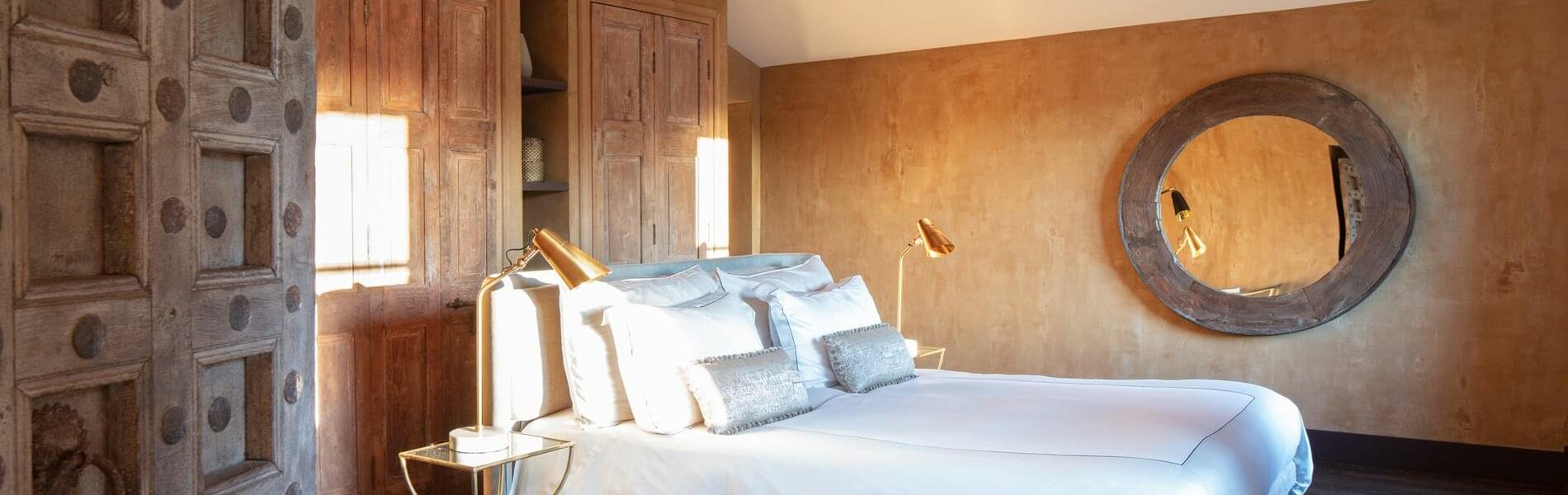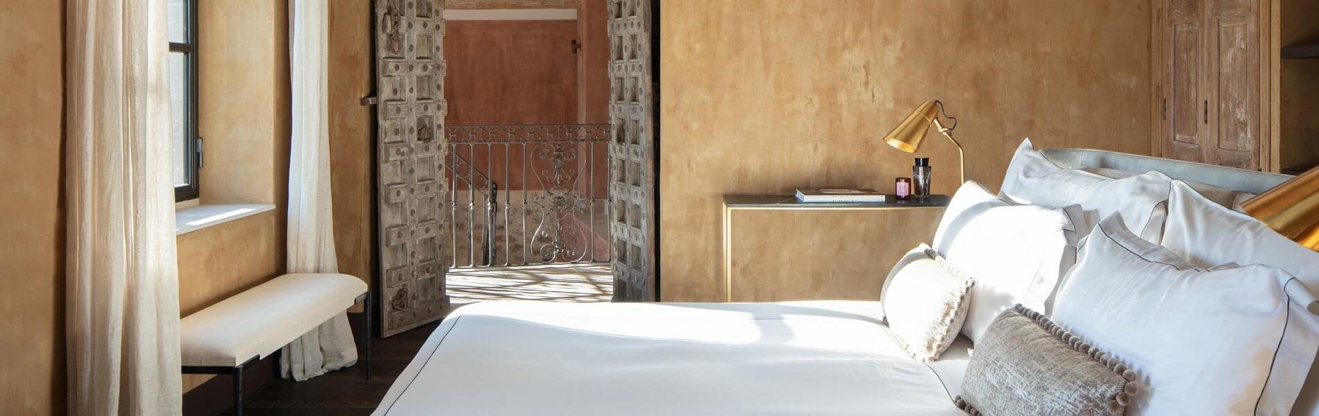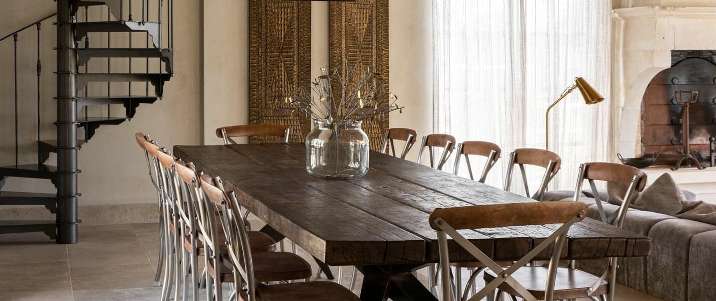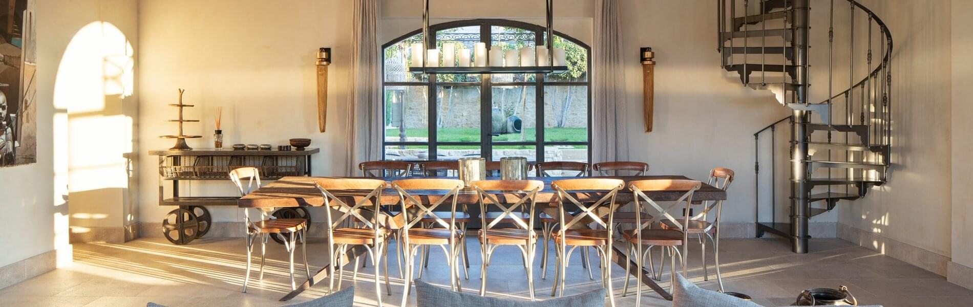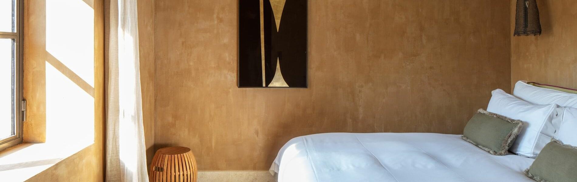 On the ground floor of the Bastide, the large living room of 80 sqm with its high bay windows opening onto the terrace and the swimming pool, its massive stone fireplace, its cozy sofas, colorful carpets and antique furniture found in flea markets. Overhanging, a dining area organized around a heavy solid oak table. The kitchen is fully equipped with a cooking piano and a wine cellar. It retains a traditional look with its high cornice furniture, its large glazed shelves and its bronze-colored travertine worktop for cooking with friends, and tasting good dishes in a warm atmosphere. Two pretty bedrooms are also located on the ground floor, with direct access to the gardens to enjoy the first rays of the sun. Upstairs, three spacious bedrooms including the large masters. For comfort, large beds, bathrooms or showers in limestone, double sinks, dressing rooms and other facilities depending on the rooms. All are air-conditioned and equipped with high-end bedding with horsehair, wool and latex mattresses. Le Labo amenities are made available in the bathrooms and a high level hotel service makes any stay at Mas Chic Alpilles a pure moment of relaxation. For rent with family or friends, to fully enjoy the French "Art de vivre", in the heart of the Alpilles and authentic Provence.