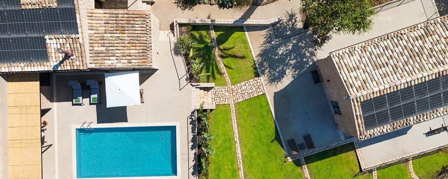 Patio, terrace with pergola, garden, swimming pool, solarium.