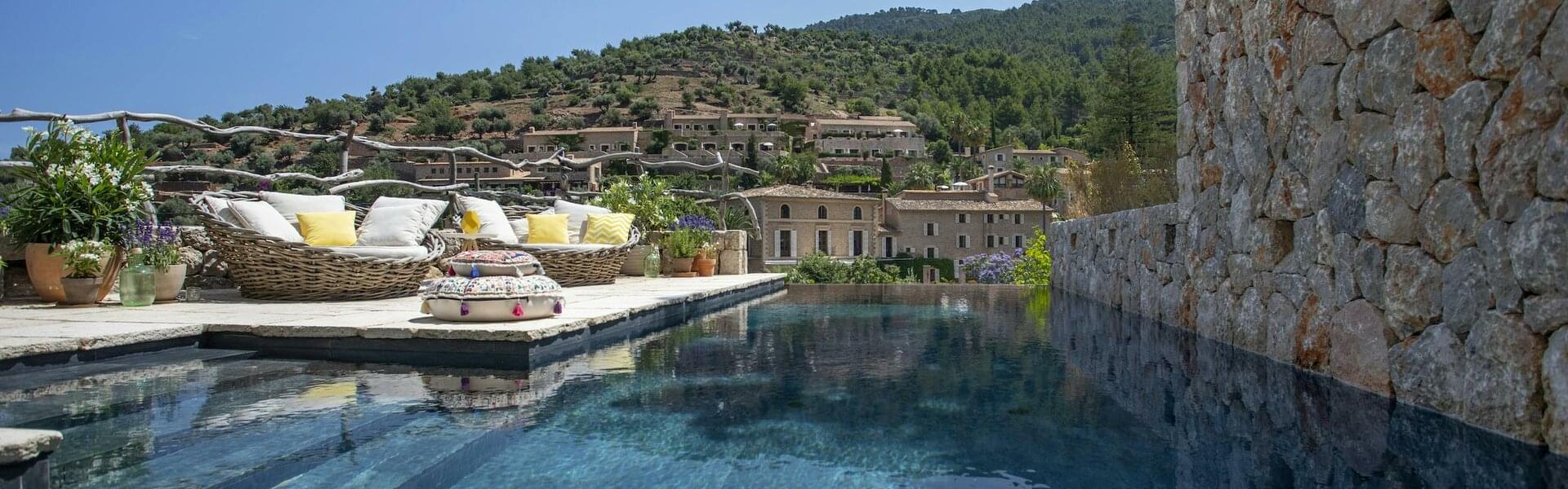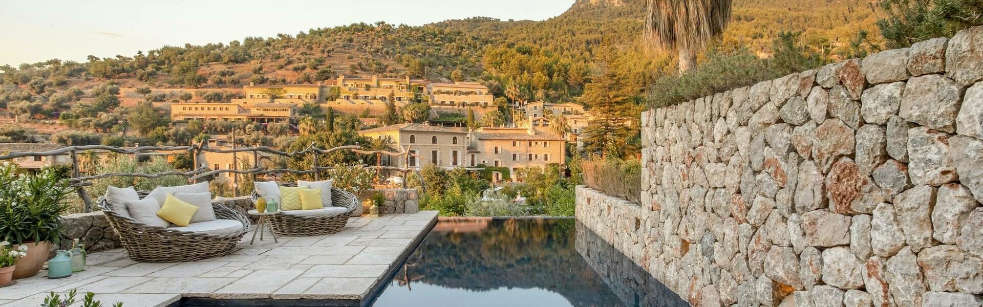 A second terrace with infinity pool, stretches out with views across the village, to the gardens of the famous La Residencia Hotel and the imposing Traumuntana Mountains.