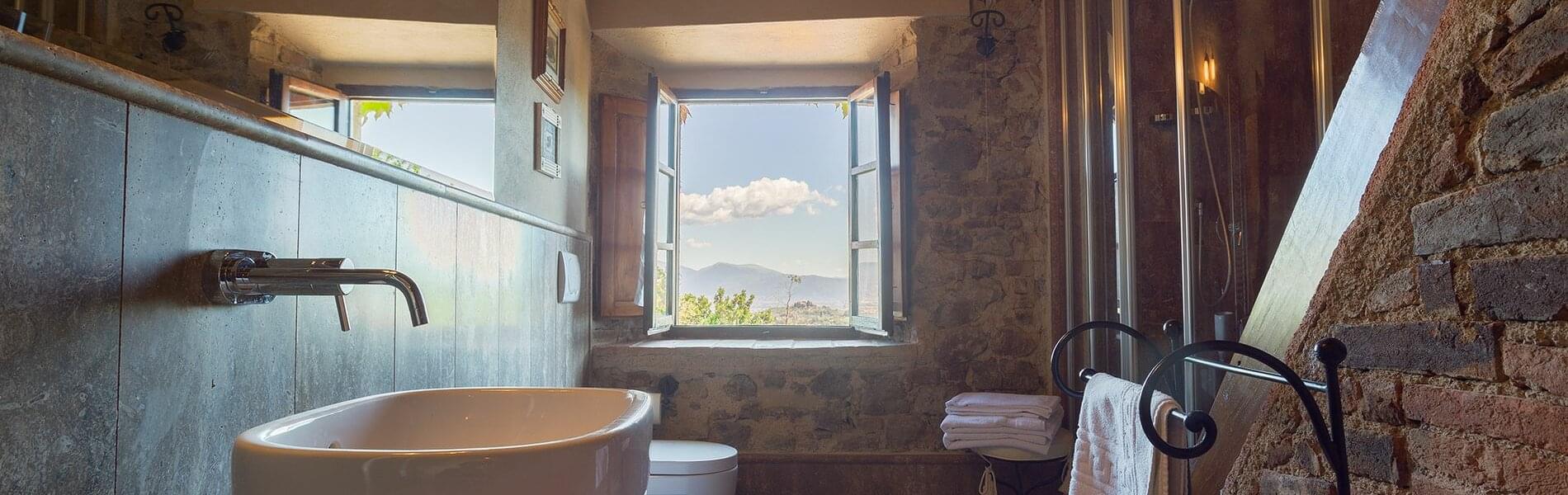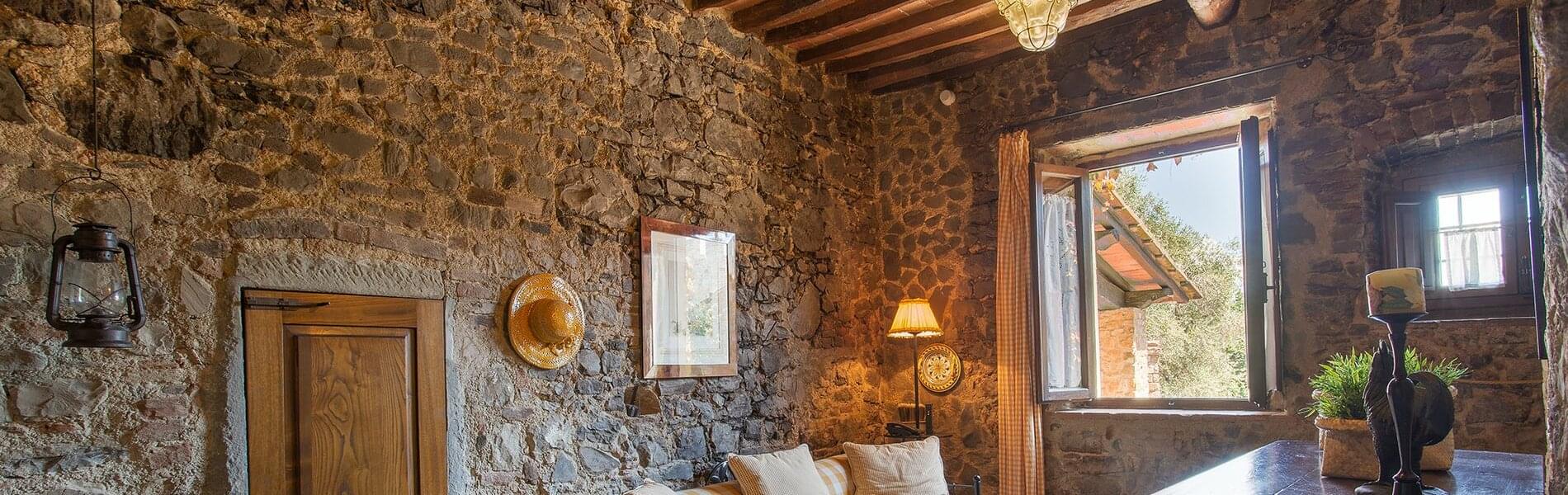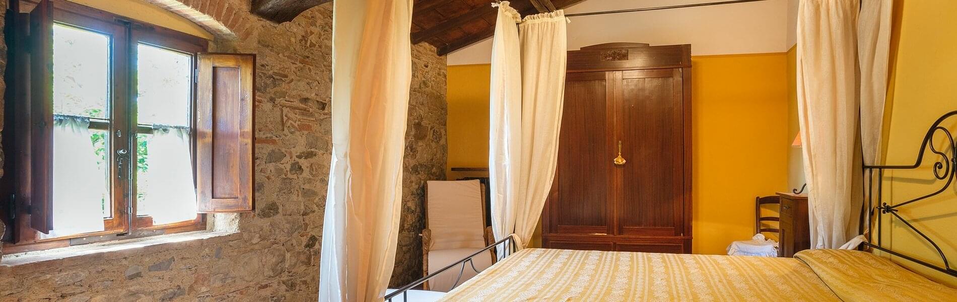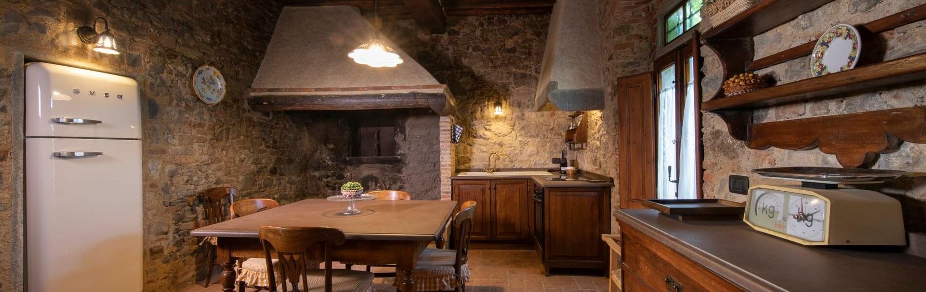 Quattro: The largest of the four houses. On two levels, sleeps 4-7 guests in two spacious double bedrooms and two sofa beds (a double and a single). Well-equipped kitchen with antique fireplace, and two bathrooms with shower. Kitchen overlooks the pool area and the Tuscan hills beyond.