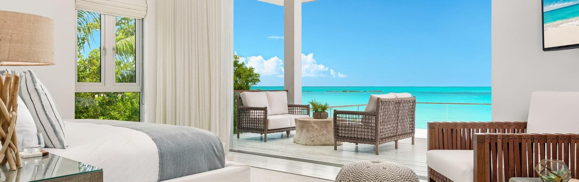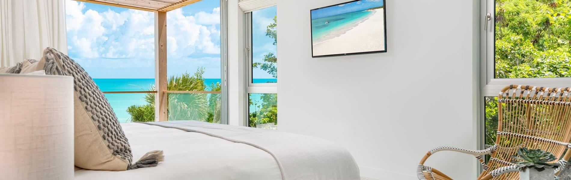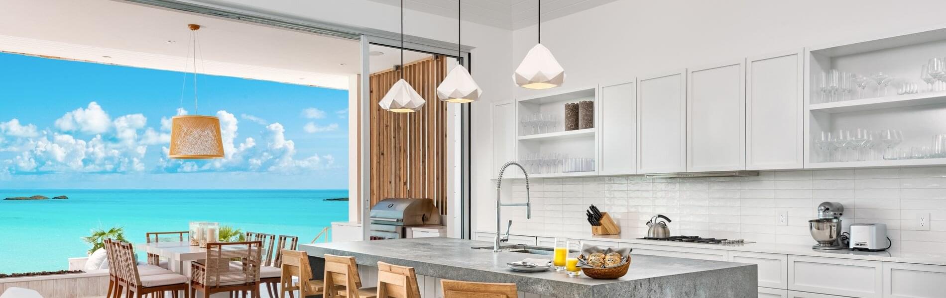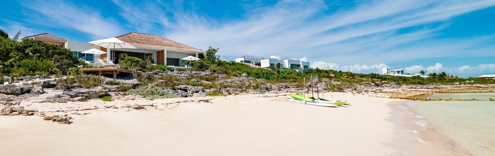 With views of the ocean from every room and enough space for eight people to spread out, Villa Bliss is a modern beach home nestled into the rocks above the shore and encircled by lush greenery. The shallow Caicos Banks extend out in front of the villa in an apparently unending stretch of serene, blue sea. The property is situated in the Turtle Tail neighborhood on the southern shore, on a beach so peaceful it will feel like yours alone.
