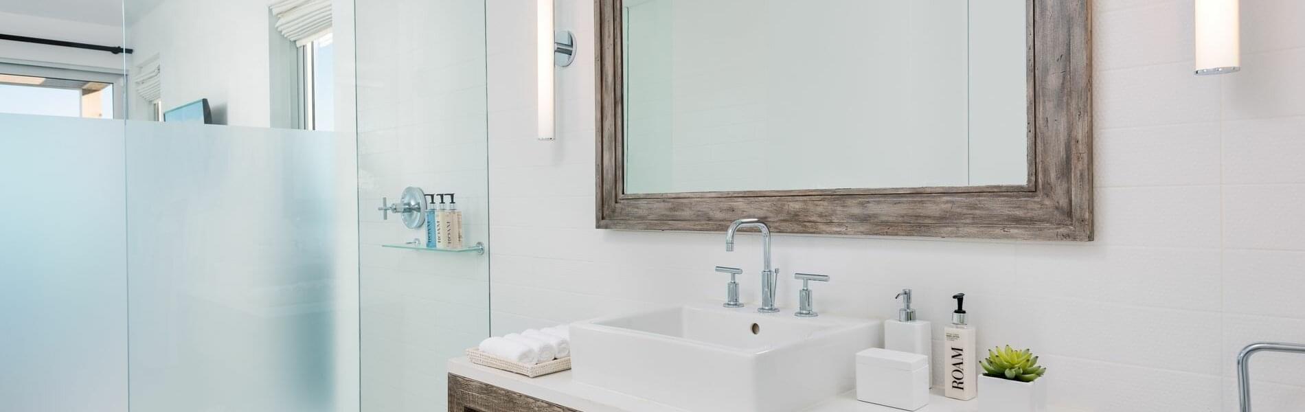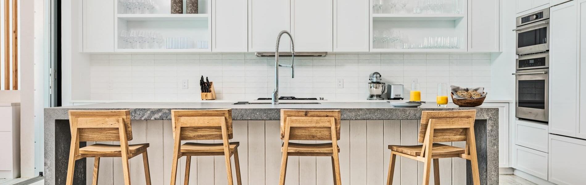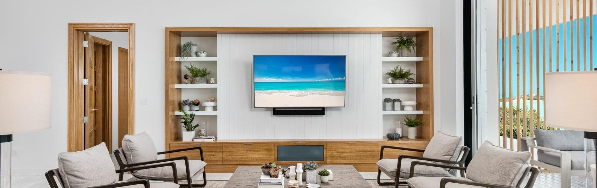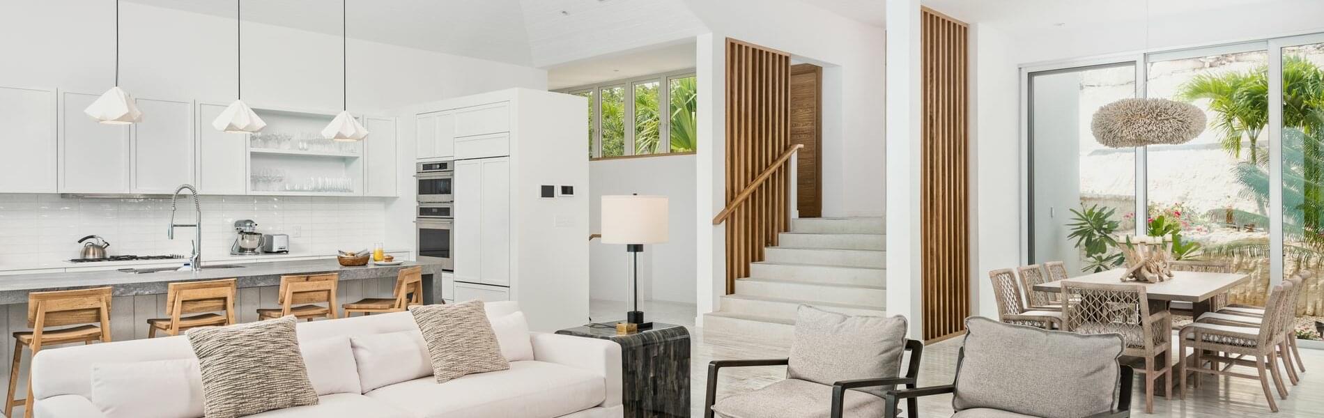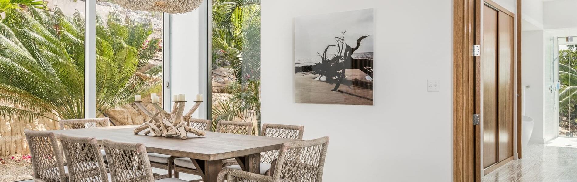 The great room's floor to ceiling glass doors guarantee that you never lose sight of the breathtaking vistas and, when opened, completely remove the distinction between the internal and outdoor living areas. consists of a breakfast bar-equipped kitchen, a cozy sitting space, and a dining room with a window overlooking the rock garden. Thanks to the sophisticated combination of mid-century modern furniture, driftwood and coral accessories, and calming, natural tones, the design strikes the ideal balance between clean lines and beach sensations.