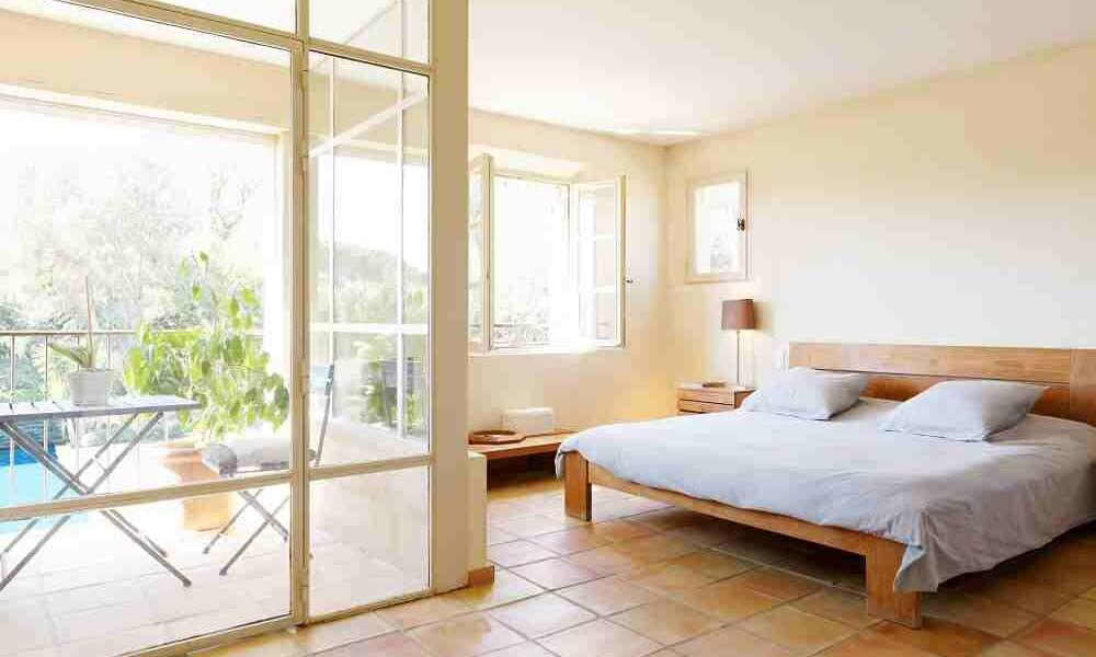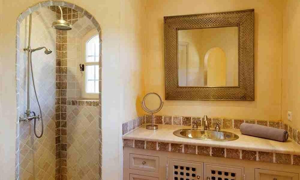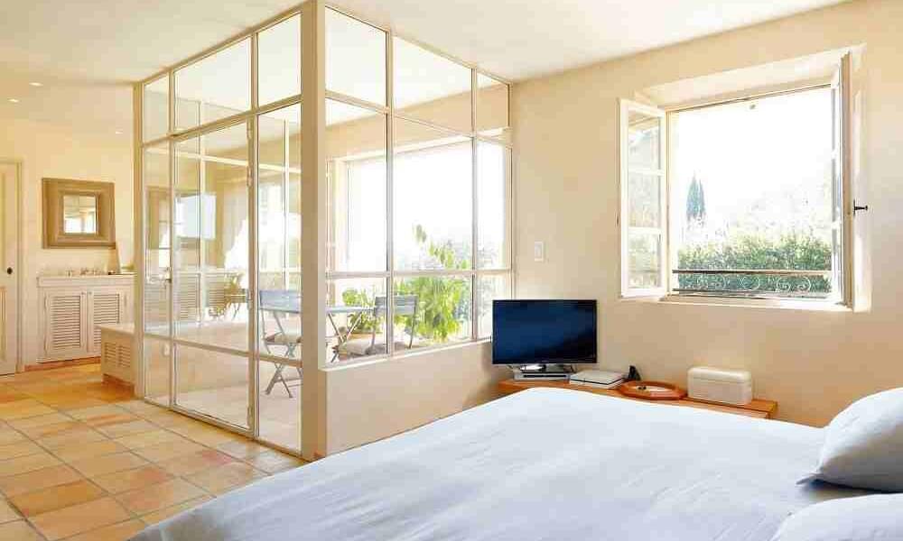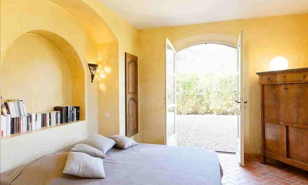 To the other side, there is a double bedroom (queen size /160 cm bed), with French windows giving direct access to the terrace and pool, en suite walk-in shower and washbasin. There is also a separate guest toilets in the hall.