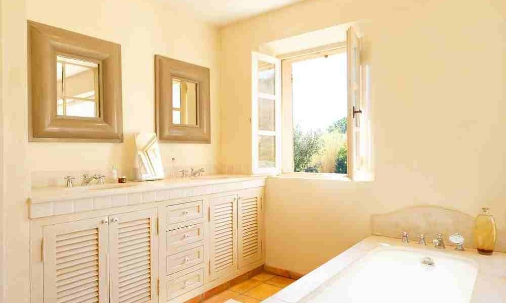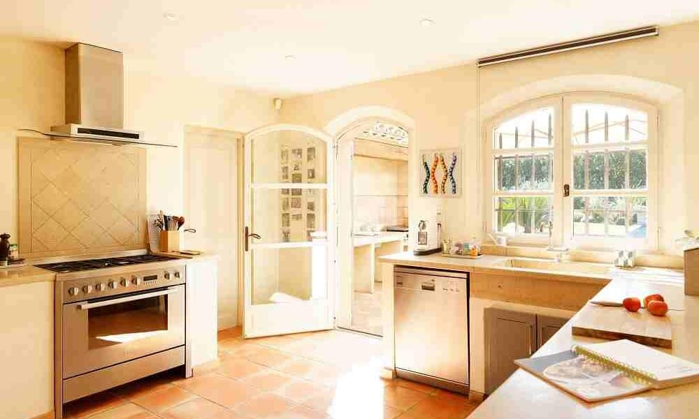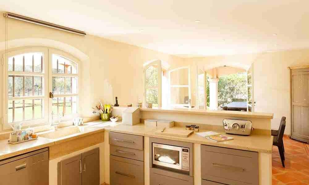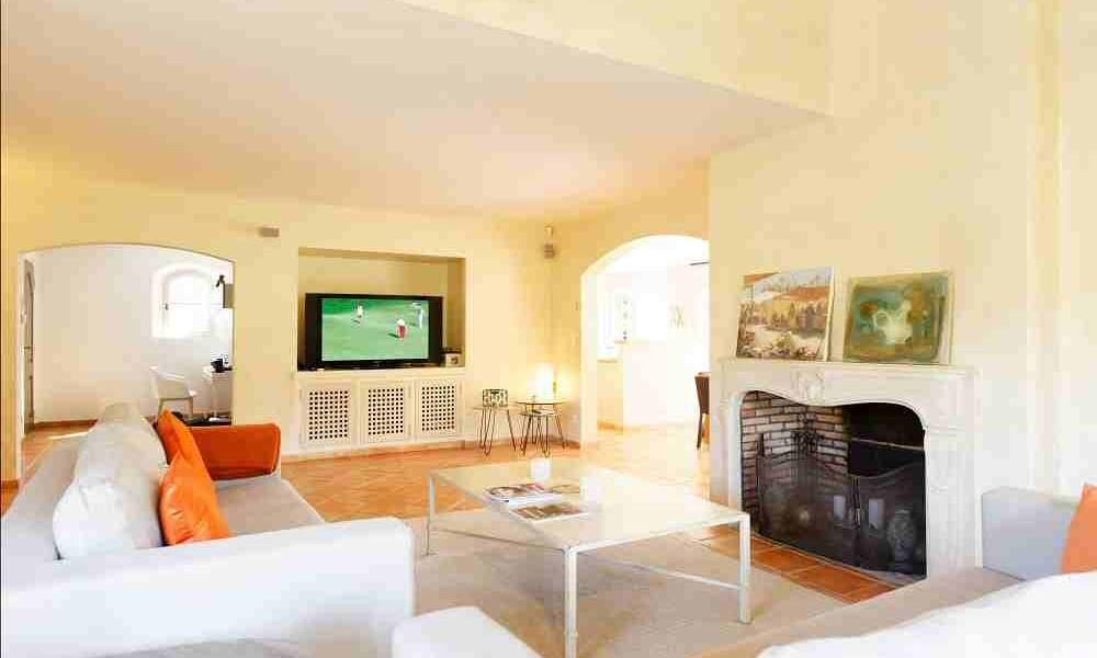 The interiors are homely with lots of light, cream and whitewashed walls, tastefully furnished, with French windows, terracotta floors and an attractive beam ceiling. Lounge with two large comfortable sofas, wooden bookcases and glass cabinet, French doors opening onto terrace and garden. An archway is leading to the dining room. A breakfast bar separates the kitchen from the dining area, which is fully equipped with fridge and freezer compartment, gas hob cooker, electric oven, microwave, dishwasher and Nespresso machine. Separate room at the back for grocery storage, extra fridge Freezer, laundry facility with washing machine and dryer.