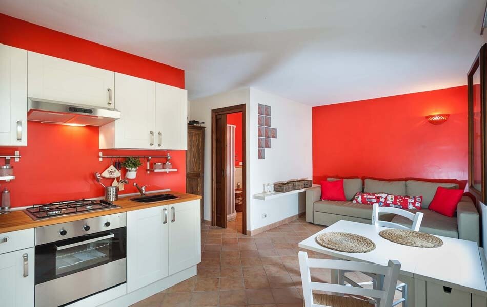 The villa is almost 1080 sq. feet and consists of three floors. On the ground floor is a comfortable living room with fireplace, a well-equipped kitchen, two double bedrooms, and a spacious bathroom with shower. The first floor, or loft area, has a study with a comfortable double sofa bed. The lower floor (accessed from outside) offers a studio room with a double sofa bed, kitchenette, and a bathroom with shower. The outside area offers a porch, furnished terraces, garden with lounge chairs, external kitchen, shower, barbecue, and private parking.