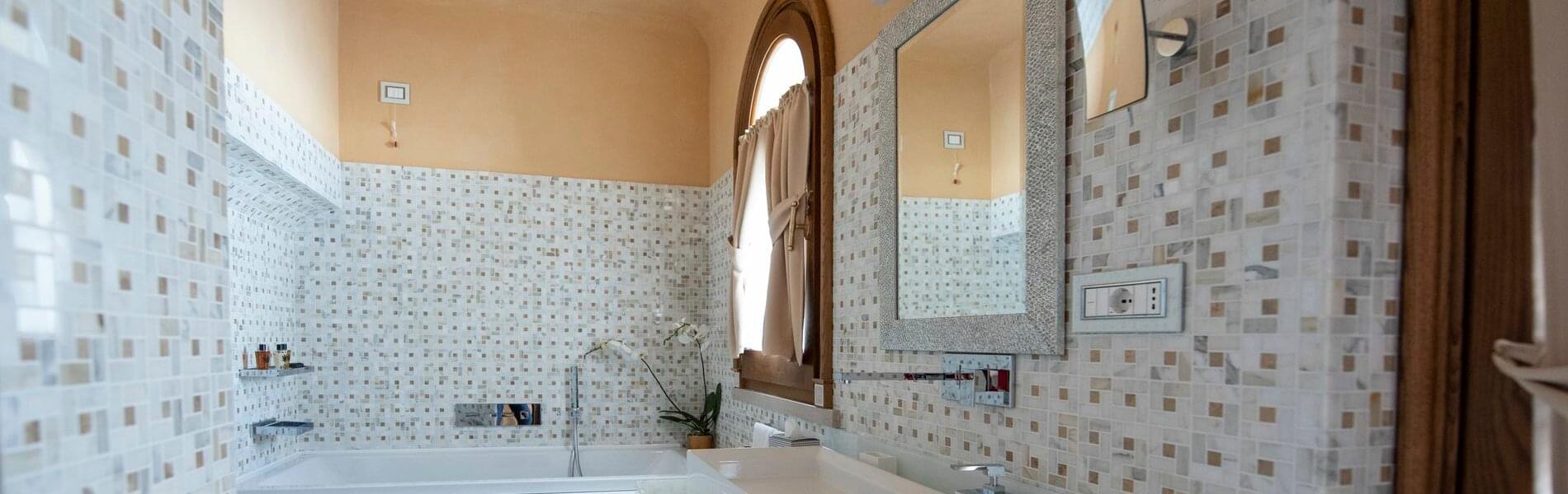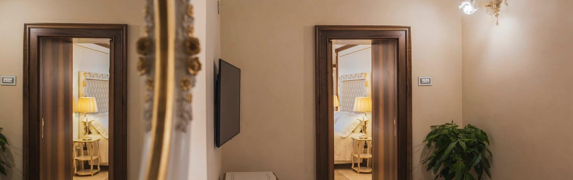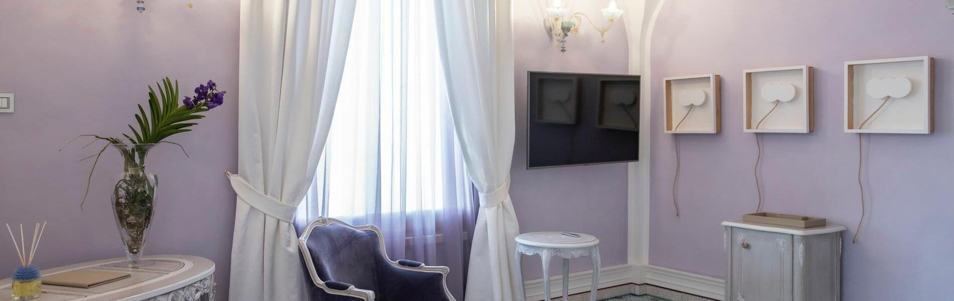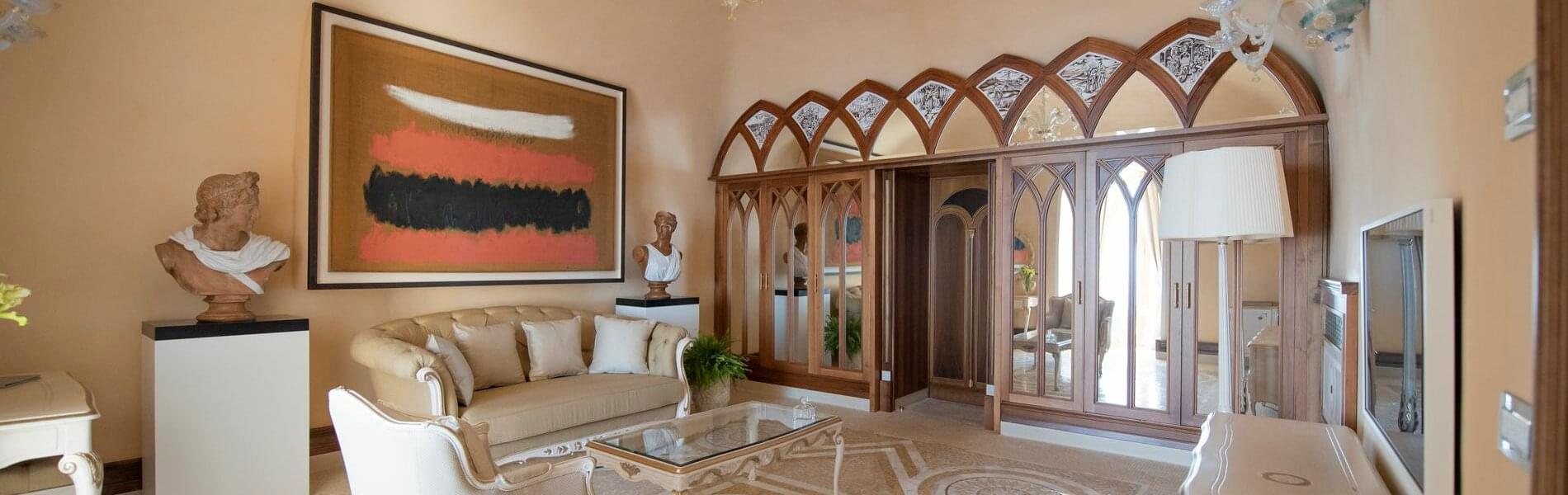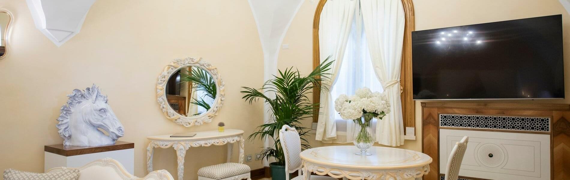 The first, larger (approximately 80 sq. mt.), includes a living room, bedroom, and small panoramic veranda with mosaic floors. The living room features a beautifully crafted built-in wardrobe, comfortable sofas and armchairs, coffee tables, a writing desk/make-up vanity with chairs, lamps, and a large TV screen. The bedroom features a fireplace, a king-size canopy double bed with a leather headboard, bedside tables, chests of drawers, lamps, and a large TV screen. The bathroom has a window and balcony with an independent exit. It includes a sink, toilet, bidet, bathtub and separate shower cubicle.