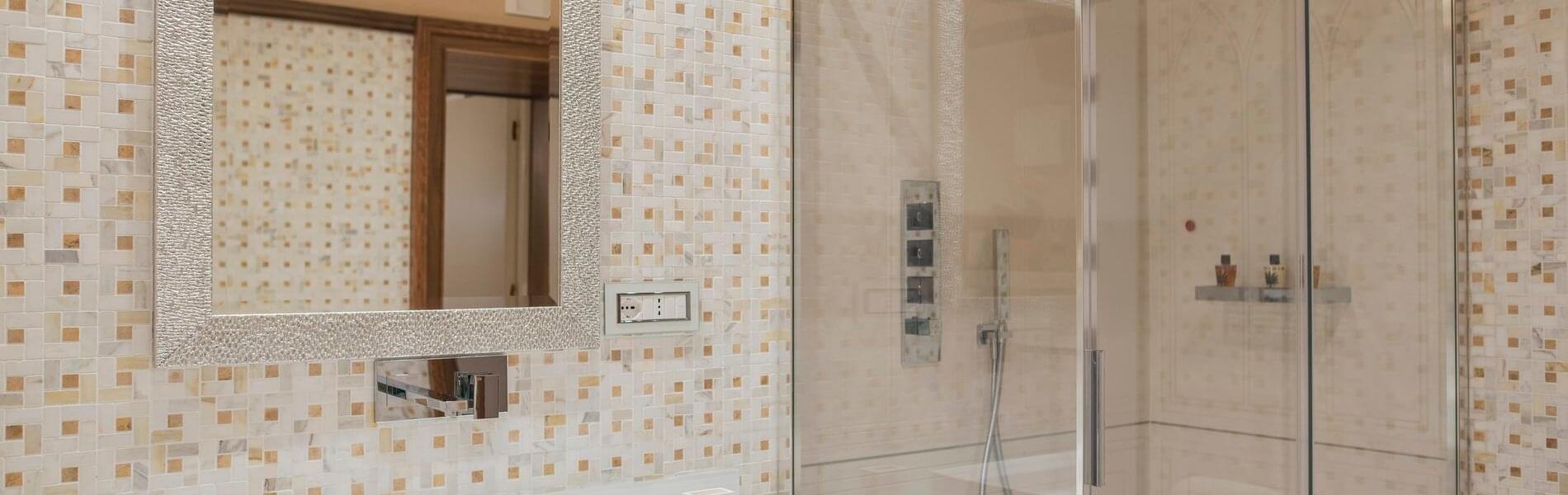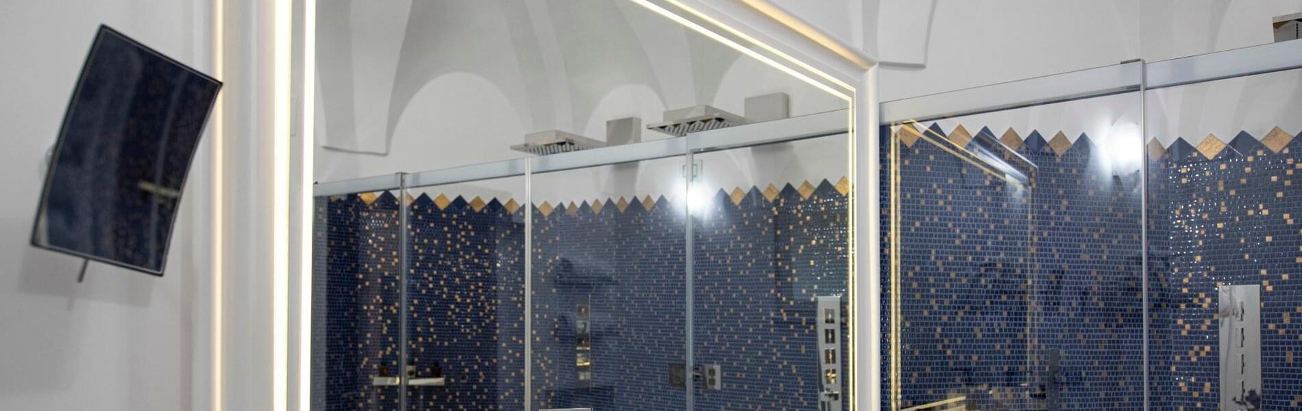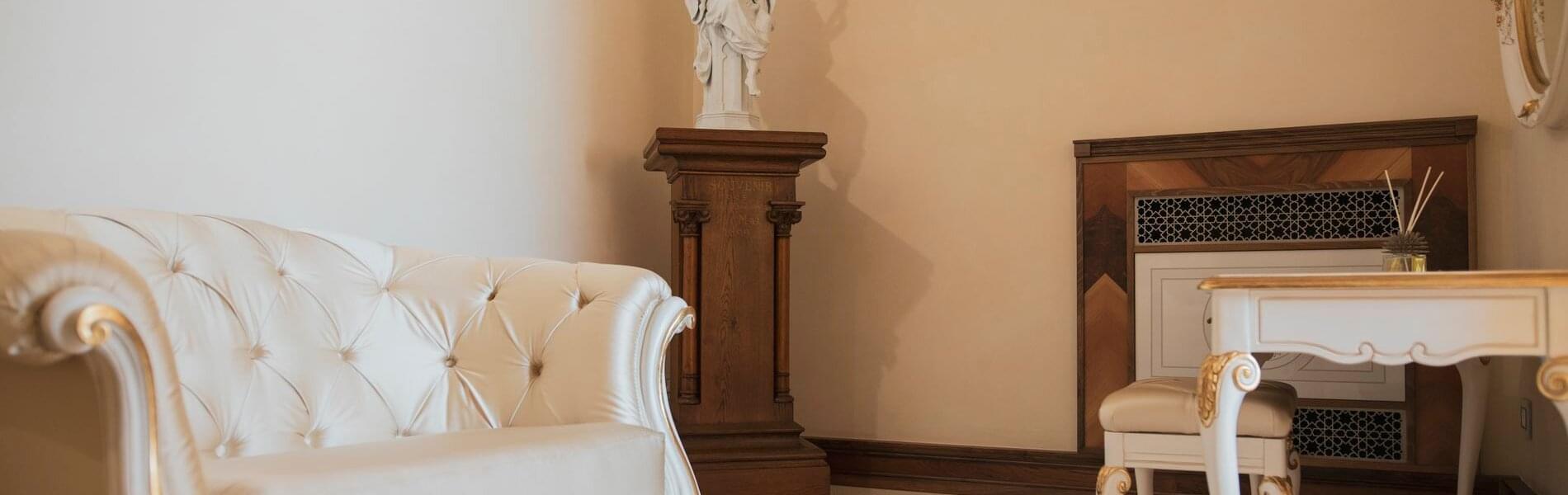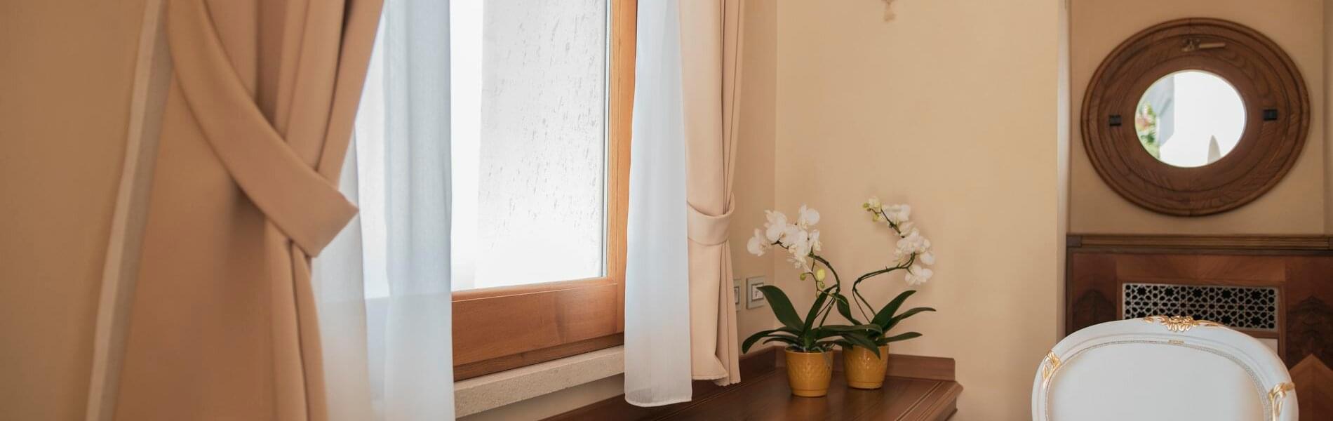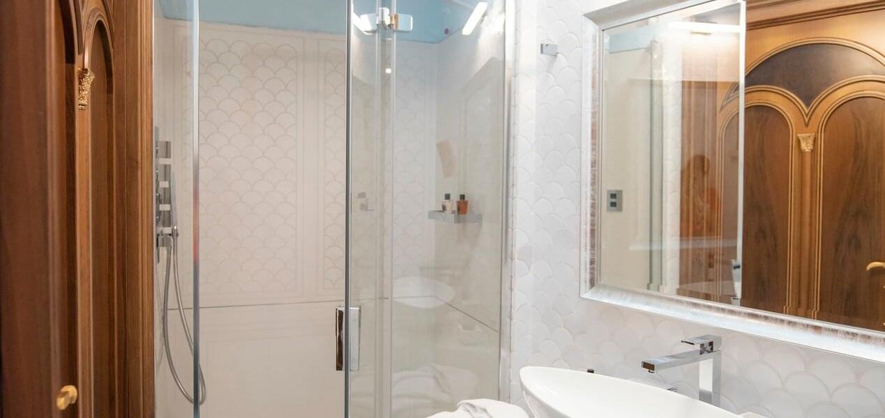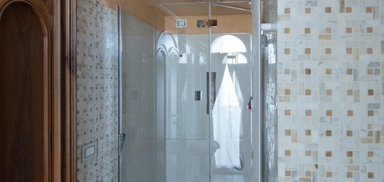 The first, larger (approximately 80 sq. mt.), includes a living room, bedroom, and small panoramic veranda with mosaic floors. The living room features a beautifully crafted built-in wardrobe, comfortable sofas and armchairs, coffee tables, a writing desk/make-up vanity with chairs, lamps, and a large TV screen. The bedroom features a fireplace, a king-size canopy double bed with a leather headboard, bedside tables, chests of drawers, lamps, and a large TV screen. The bathroom has a window and balcony with an independent exit. It includes a sink, toilet, bidet, bathtub and separate shower cubicle.