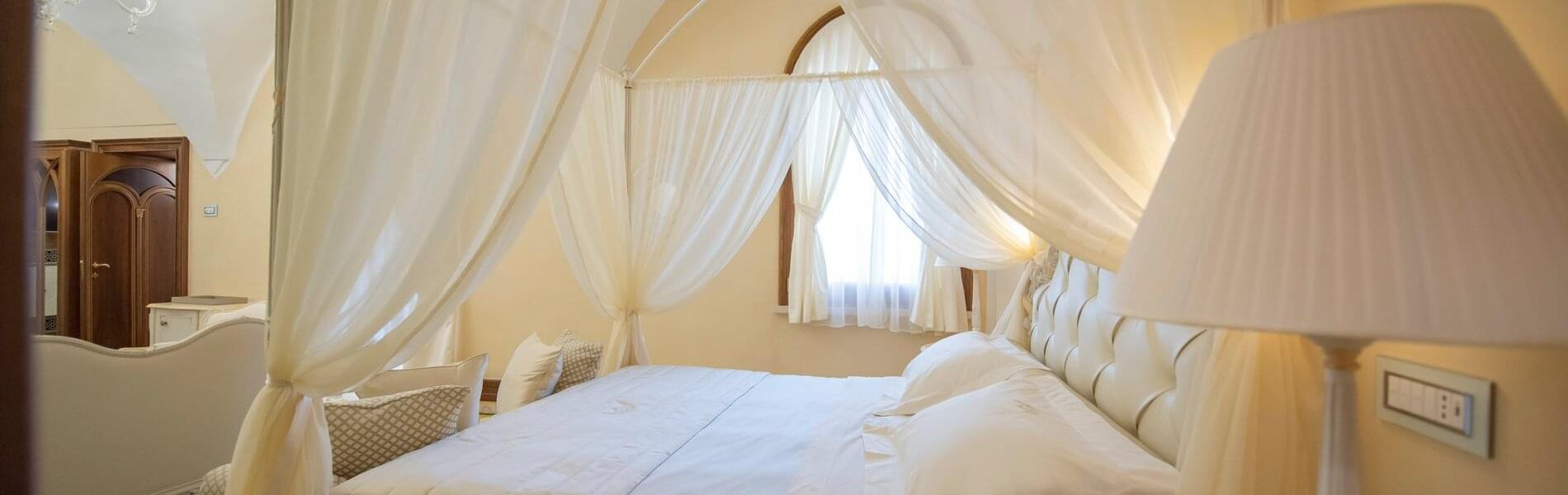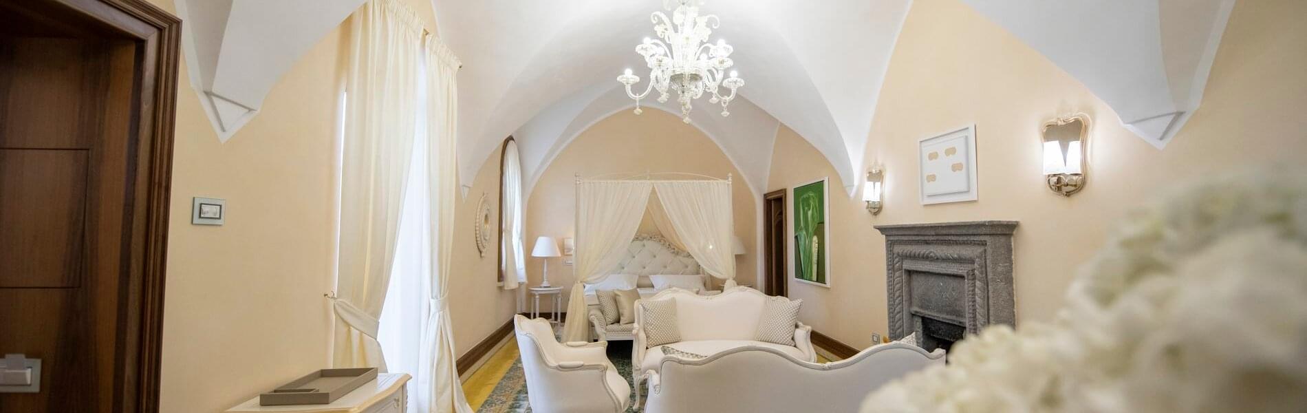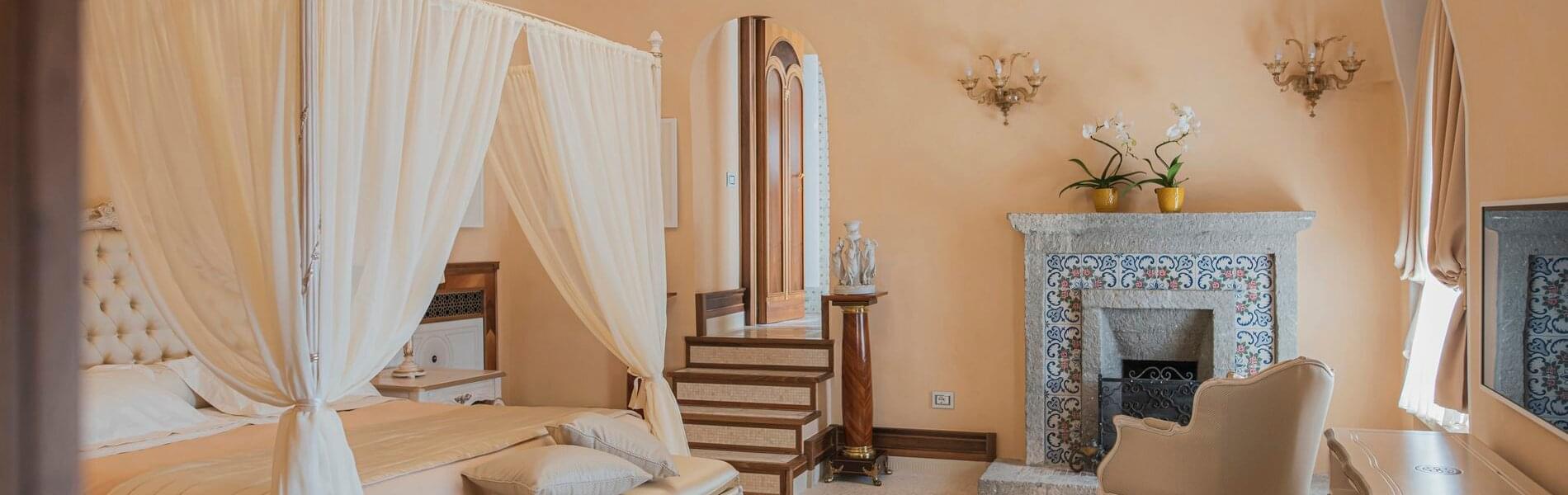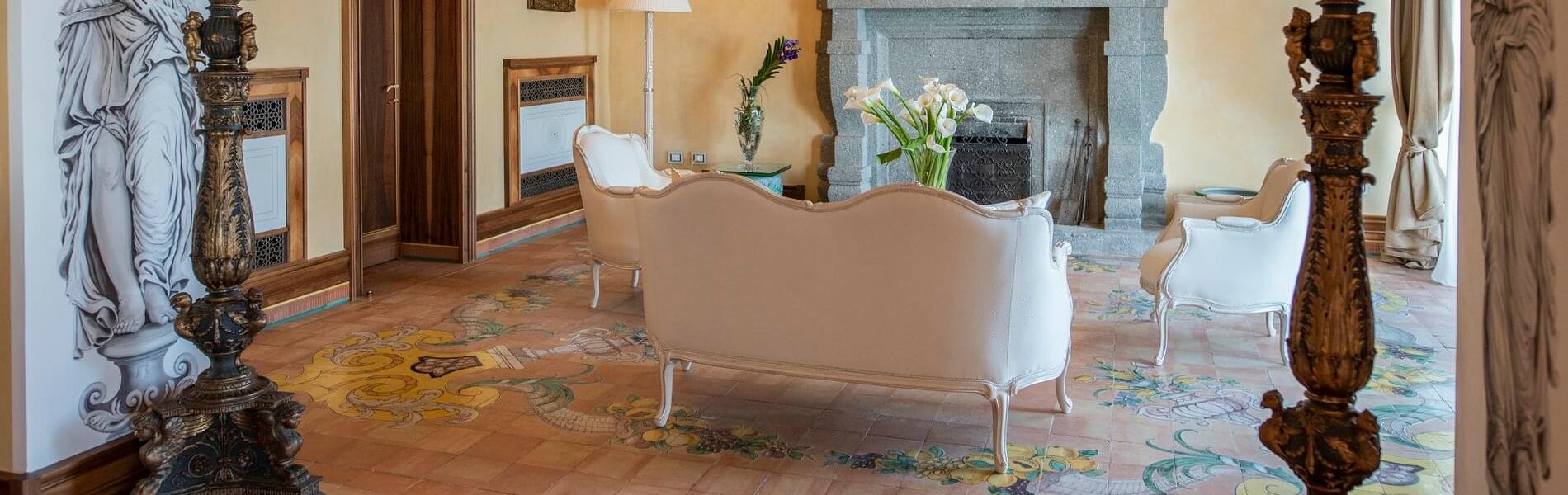 On level + 1 (floor +one), there is one Junior Suite and one Superior Room. It has antique floors made of precious Vietri ceramics and a fireplace. The room features a king-size canopied double bed with a leather headboard, bedside tables, chests of drawers, lamps, a large TV screen, a built-in wardrobe, sofas, armchairs, coffee tables, and a writing desk/make-up toilet with seats. The bathroom with a window includes a sink, toilet, bidet and a spacious shower cubicle.