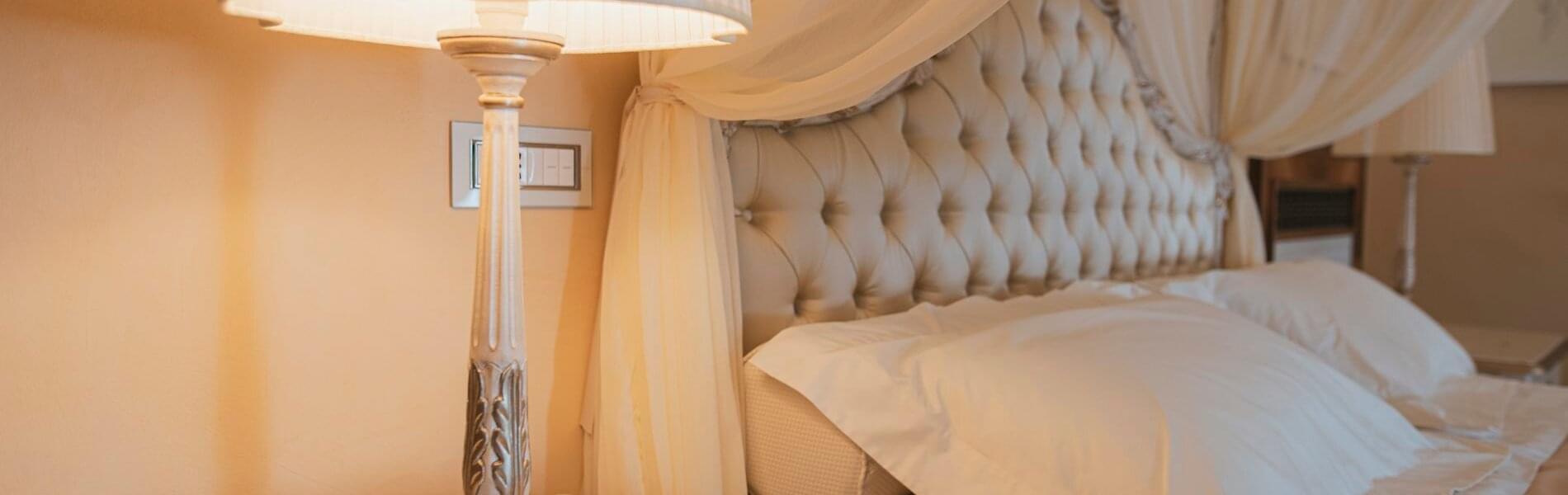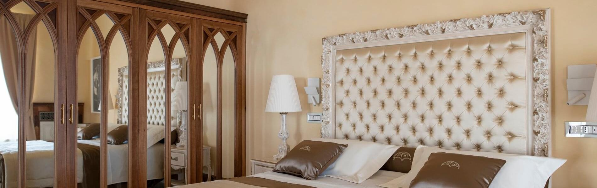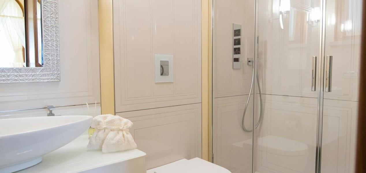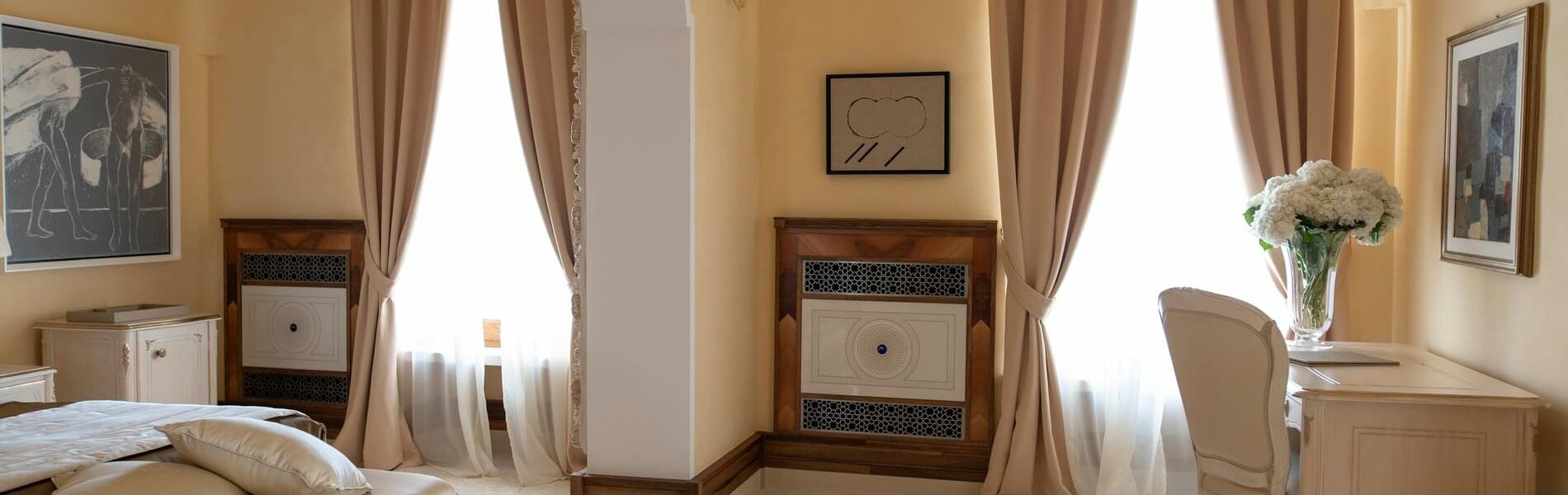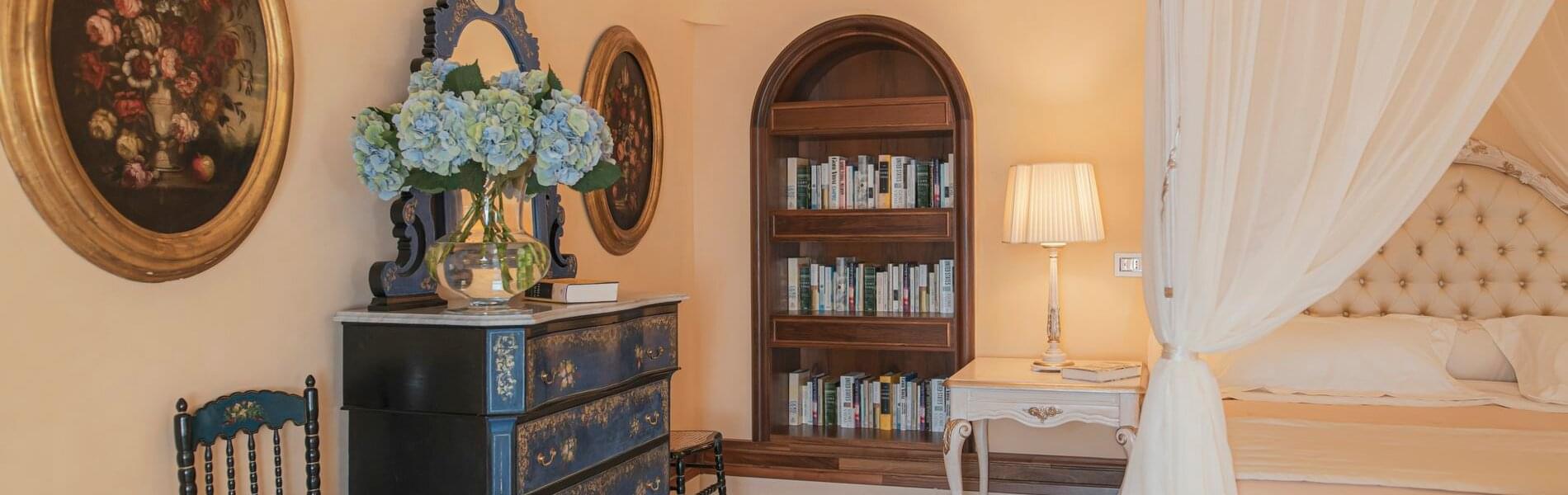 On level + 1 (floor +one), there is one Junior Suite and one Superior Room. It has antique floors made of precious Vietri ceramics and a fireplace. The room features a king-size canopied double bed with a leather headboard, bedside tables, chests of drawers, lamps, a large TV screen, a built-in wardrobe, sofas, armchairs, coffee tables, and a writing desk/make-up toilet with seats. The bathroom with a window includes a sink, toilet, bidet and a spacious shower cubicle.