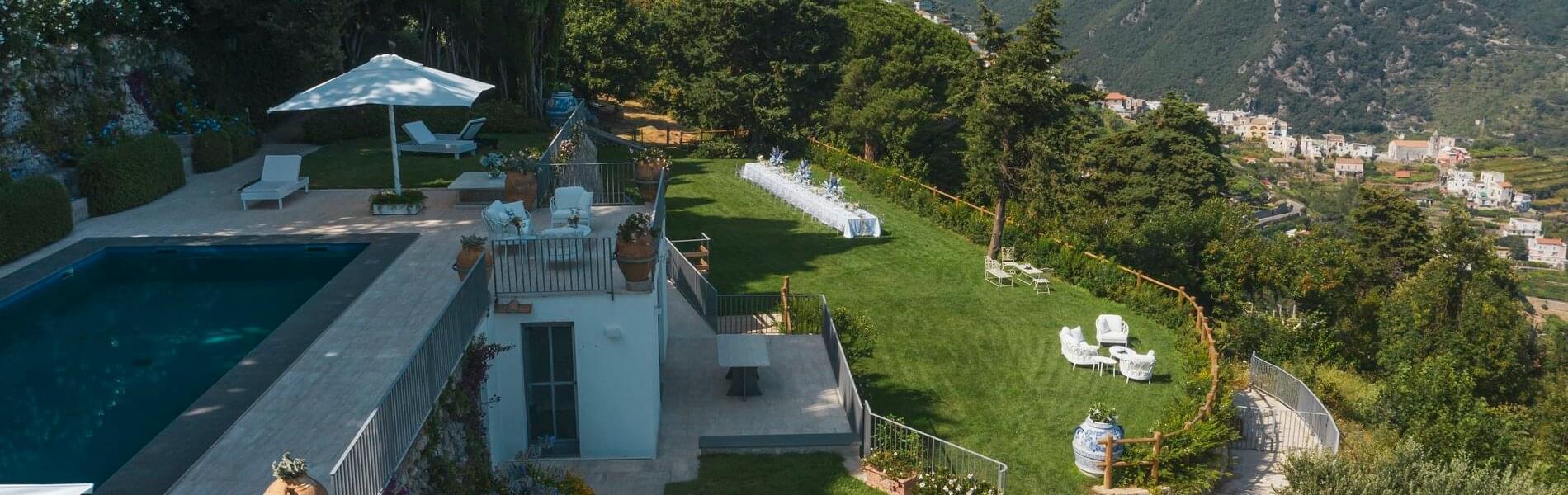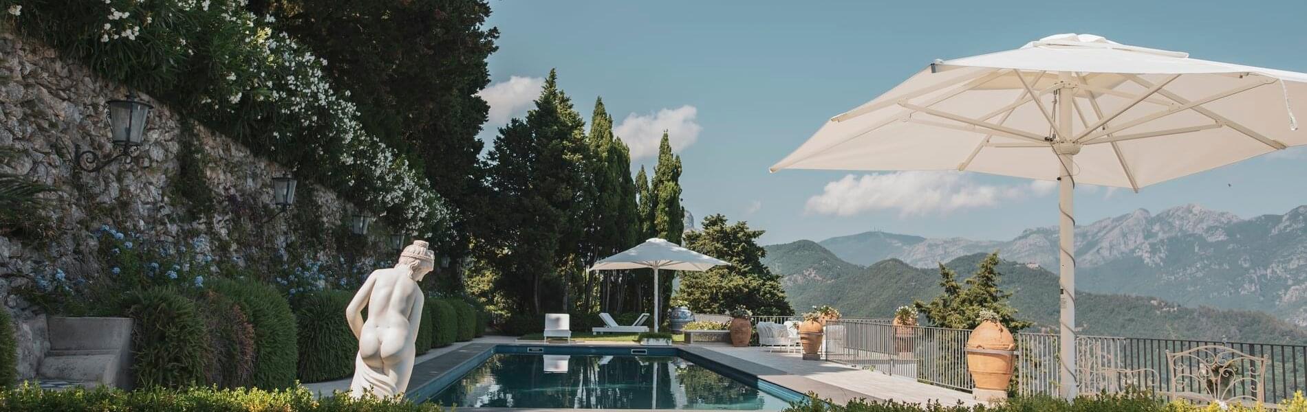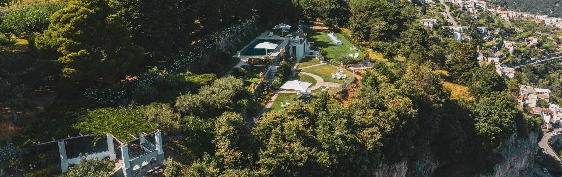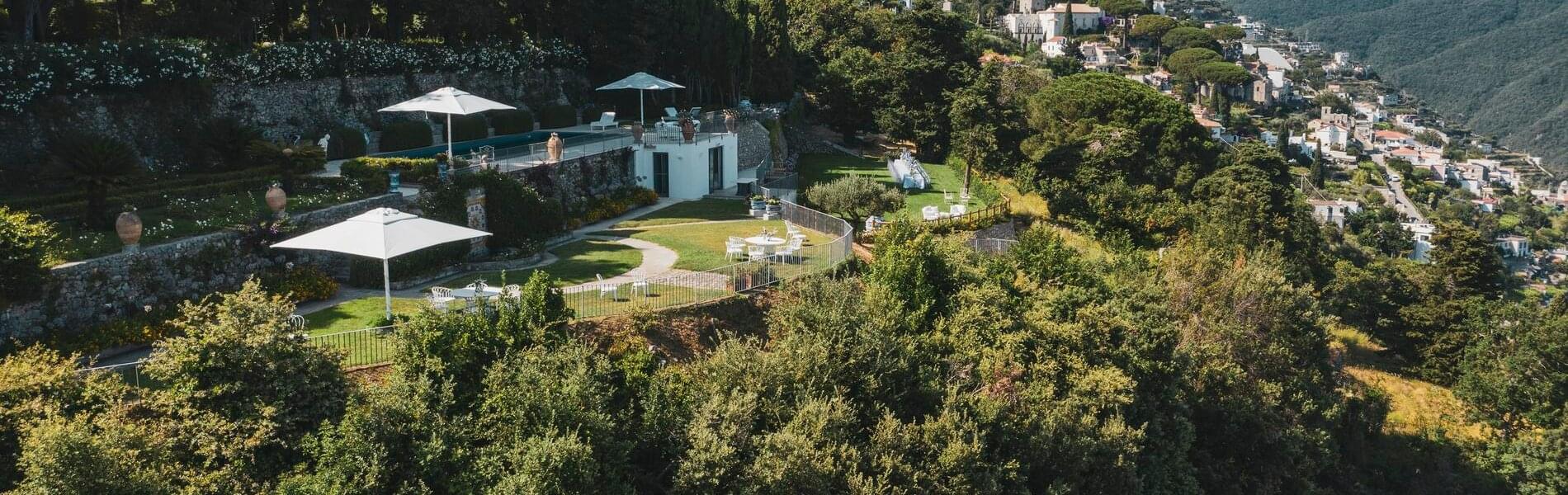 Villa Hirondelle, an elegant historic residence set in terraced gardens with breathtaking views of the Amalfi Coast and the Gulf of Salerno, is reminiscent of a fairytale. The Villa is nestled in a stunning park, resembling a swallow's nest suspended over a breathtaking overhang. It offers high standards of confidentiality and privacy.