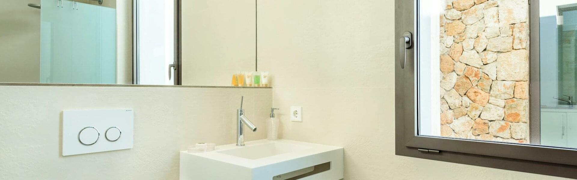 The spacious, light-filled rooms create a blissful sense of light and space throughout the villa, and this continues throughout the bedrooms. With crisp, white lines and pale, neutral tones, the bedrooms enjoy either wonderful garden views or added privacy via the stone courtyard walls, plus luxurious en-suite bathrooms.