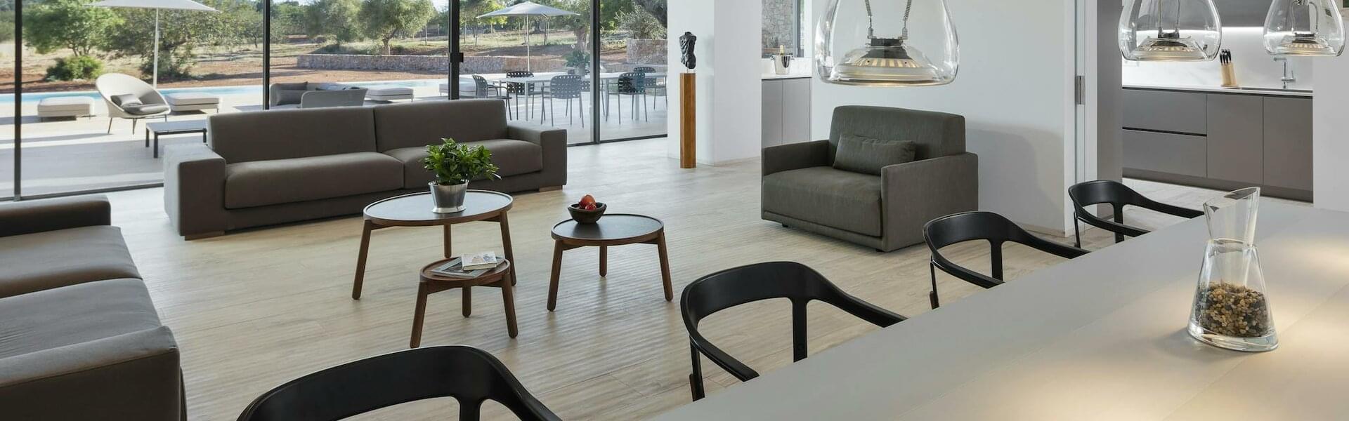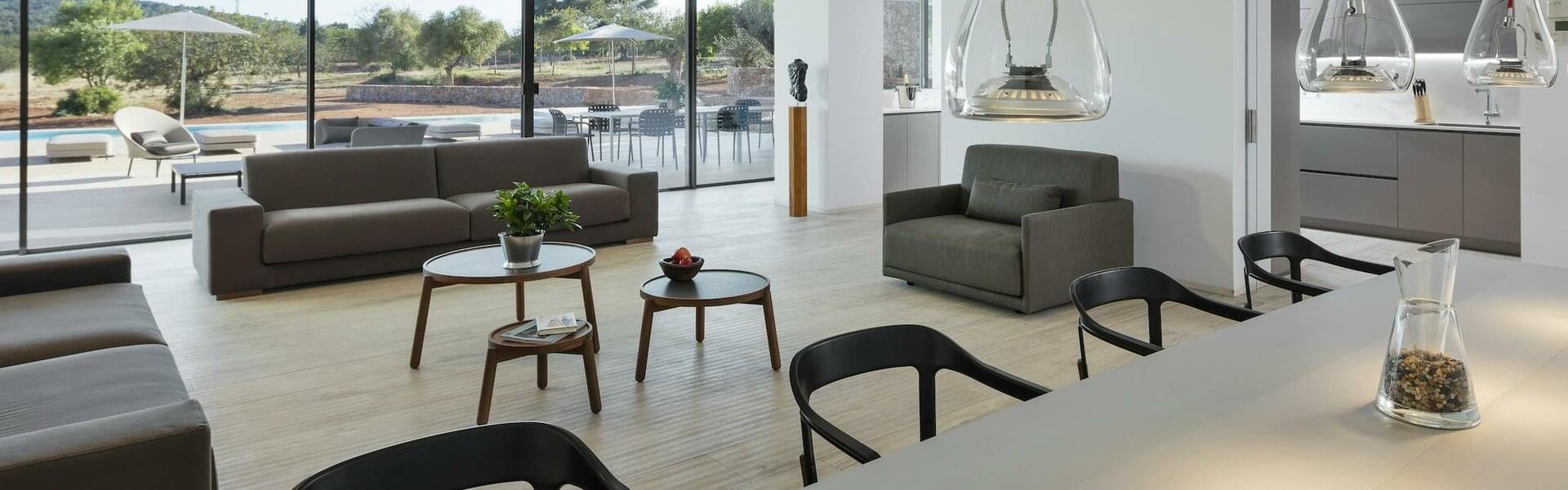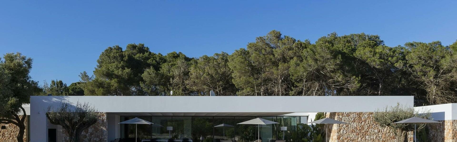 Wide sliding glass doors connect the inside and outside spaces and flood the interior with bright Ibizan sunlight. Cool white walls, pale wood floors and understated contemporary furniture ensure the serene ambiance continues throughout the villa’s interior.