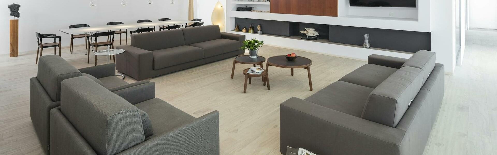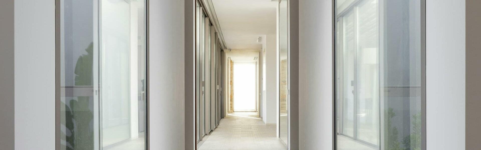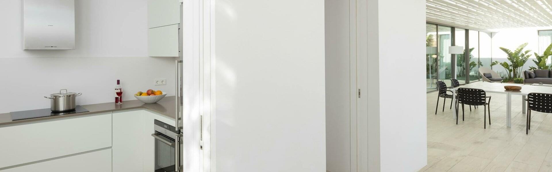 Wide sliding glass doors connect the inside and outside spaces and flood the interior with bright Ibizan sunlight. Cool white walls, pale wood floors and understated contemporary furniture ensure the serene ambiance continues throughout the villa’s interior.