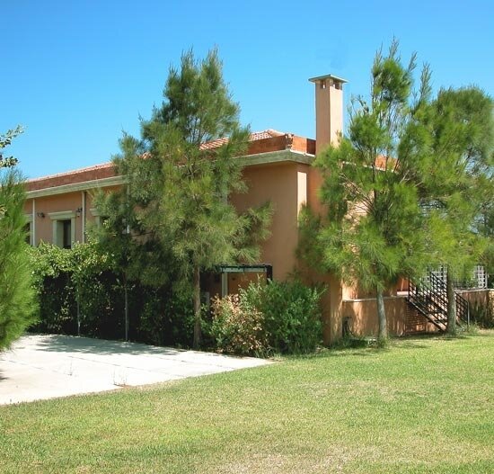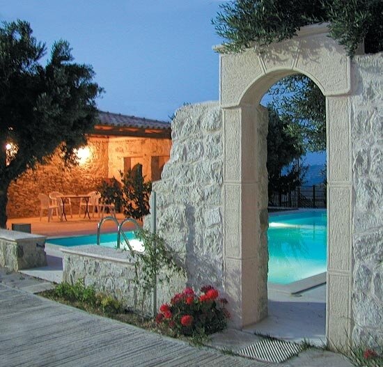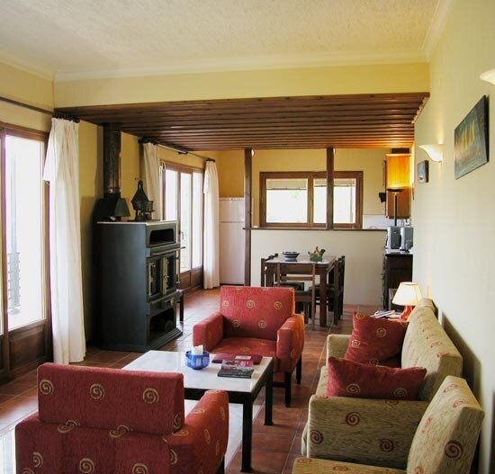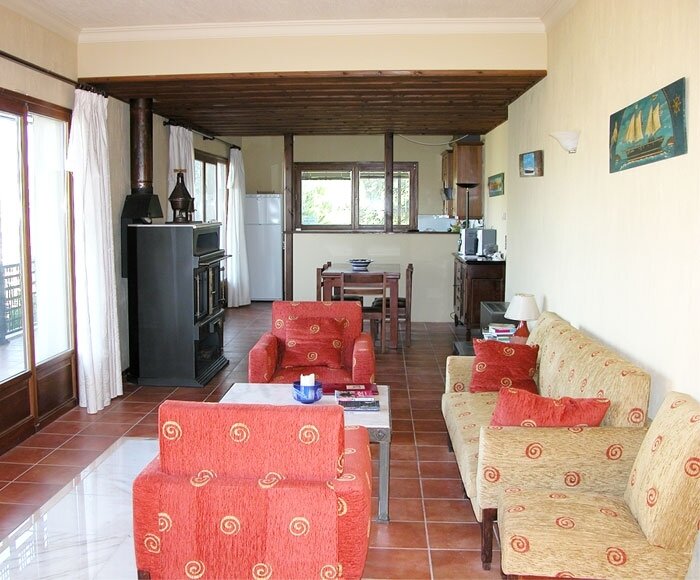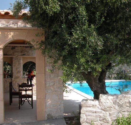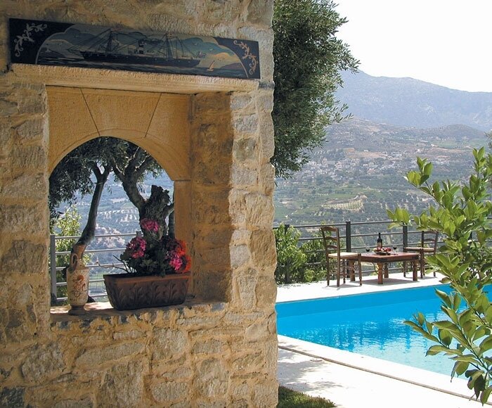 Upon arrival at Villa Knossos 1 it is easy to be overwhelmed by its dramatic surroundings. Greeting you are a large, lovely pool with stone terraces and covered dining area, views of fertile plains and abrupt, rocky mountains, and soft, aromatic breezes. The villa itself is a charming mix of traditional Greek style fused with modern amenities. The comfortable, spacious living area offers a sofa, table, fireplace, chairs and direct access out onto a large verandah with spectacular views. The dining table offers seating for five and the kitchen comes fully equipped with all necessities (fridge/freezer, stove, oven, dishwasher, toaster, coffee maker). All three, nicely decorated bedrooms (one with double bed, one with two twins and the third with single bed) have air conditioning and share a bathroom with sink, toilet and bathtub with handheld showerhead.
