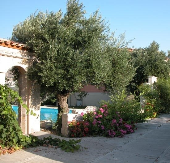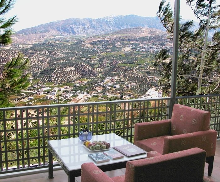 Villa Knossos 1 is part of an enclosed 50 acre estate situated on a hill amidst the rugged beauty of the island of Crete. This vacation rental in Crete offers unsurpassed views of the fertile, green plain of Ayios Sillas and the wild beauty of the nearby Mt. Zeus (Giouxtas). Within the property are vineyards, olive trees, fruit trees, aromatic trees and herbs. Because the estate is a working farm, many animals are also to be found; goats, ducks, geese, chicken, horses, cows and boar, among others. The refreshing, private pool offers relief from the summer sun and the large, furnished terrace just begs outdoor dining. Upon arrival, guests are treated to a welcoming meal and a complementary basket filled with essentials and fresh produce. Included in the rental price are twice weekly cleanings and linen changes. Extra services include airport transfers (50 euro roundtrip), pre-stocked groceries (10 euro + cost of groceries), and chef services. Although Villa Knossos 1\'location on the north side of the island allows access to most of the major tourist spots, its existence as a working farm enables the visitor to also experience life like a local and be a part of the community. Villa Knossos 1 is located in an area called \"Malades,\" just south of Heraklion. It is a quiet, secluded area with beautiful views. Nearby there are some tavernas, a gas station, and a small supermarket with a butcher. This is a great location for day trips to many of Crete\'s archeological sites, such as the Palace of Knossos, the cities of Heraklion, Agios Nikolaos, Rethymnon and Chania, as well as the beaches on the south side of the island.