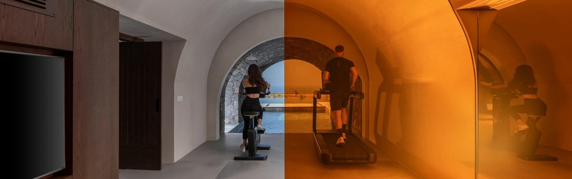 The villa is equipped with Bluetooth sound systems indoors and outdoors, climate cooling/heating system, underfloor heating for the winter, gym, PC workstations, outdoor pool, indoor/outdoor gym pool (heated with extra charge) , and Wi-Fi, laundry room