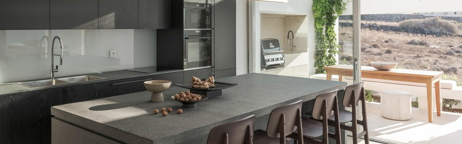 A statement dining area with dining table crafted from fossilized marble and a fully equipped marble kitchen ideal for private chefs or gourmet meals. Direct access to an outdoor gas BBQ station and an outdoor dining area shaded by a pergola.
