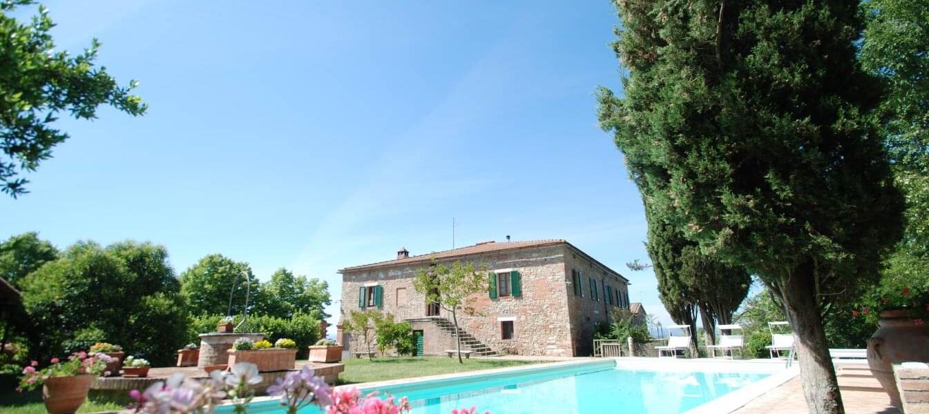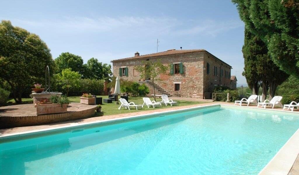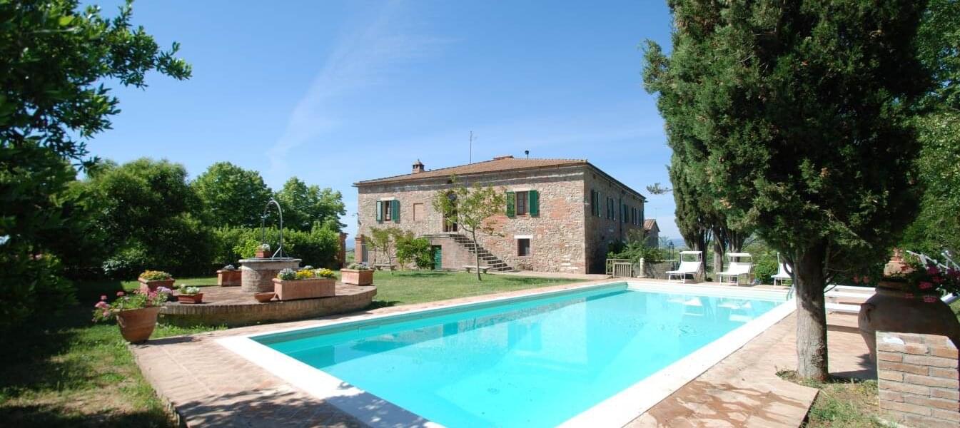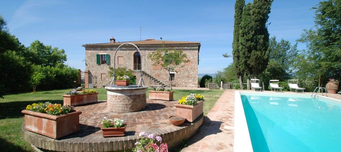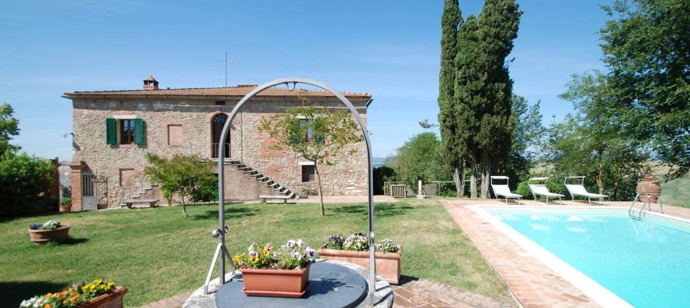 Villa Panorama is a traditional Tuscan country house rental situated in the beautiful area known as \"Le Crete Senesi\" south of Siena, with breathtaking views over the rolling hills. Part of a working farm, the main product today is cereal. This independent farmhouse was recently restored ensuring that it remains true to its Tuscan origins and fully preserving its important rural history. Therefore it has a large well equipped kitchen with a massive fireplace which still remains the focal point of the house. High beamed ceilings and a mixture of traditional, elegant, and modern furniture give it the comfort and charm you\'re looking for. The spacious living/dining room next to the kitchen gives a large gathering place, and there is a study/reading room besides. Four of the five bedrooms have ensuite bathrooms with shower. The large fifth bathroom is at the end of a wide corridor. The private Italian garden is furnished with table and chairs for al fresco dinners as well as a nice swimming pool for your exclusive use. The beautiful village of Asciano is only 7 kms and offers restaurants, shops, supermarket, and banks. Siena is a near 24 kms.