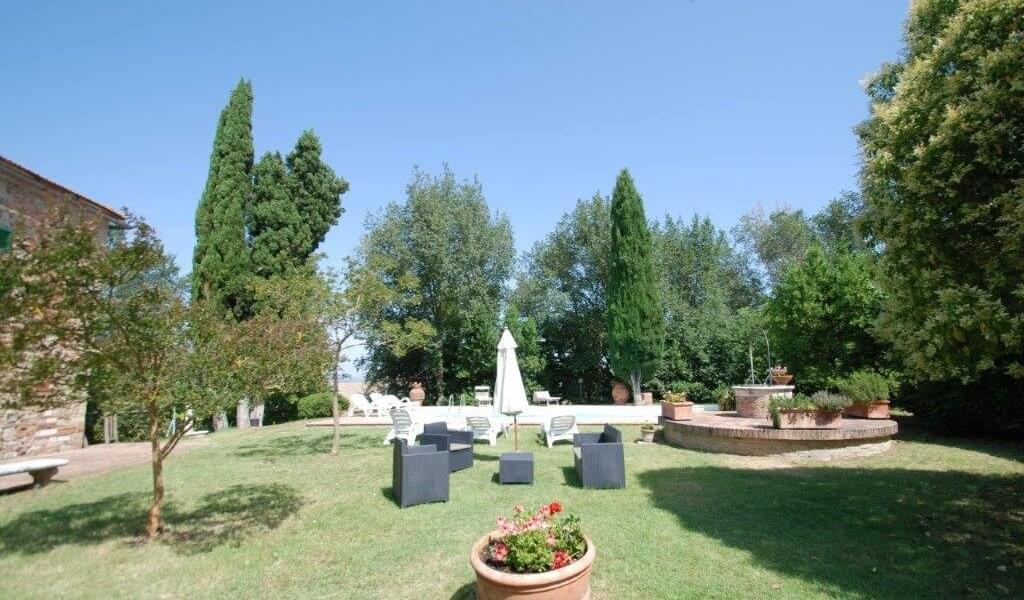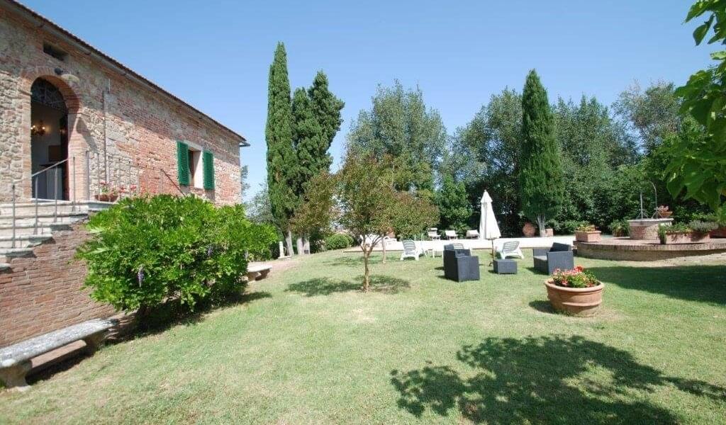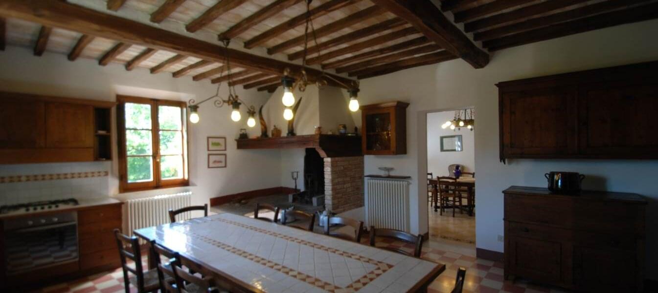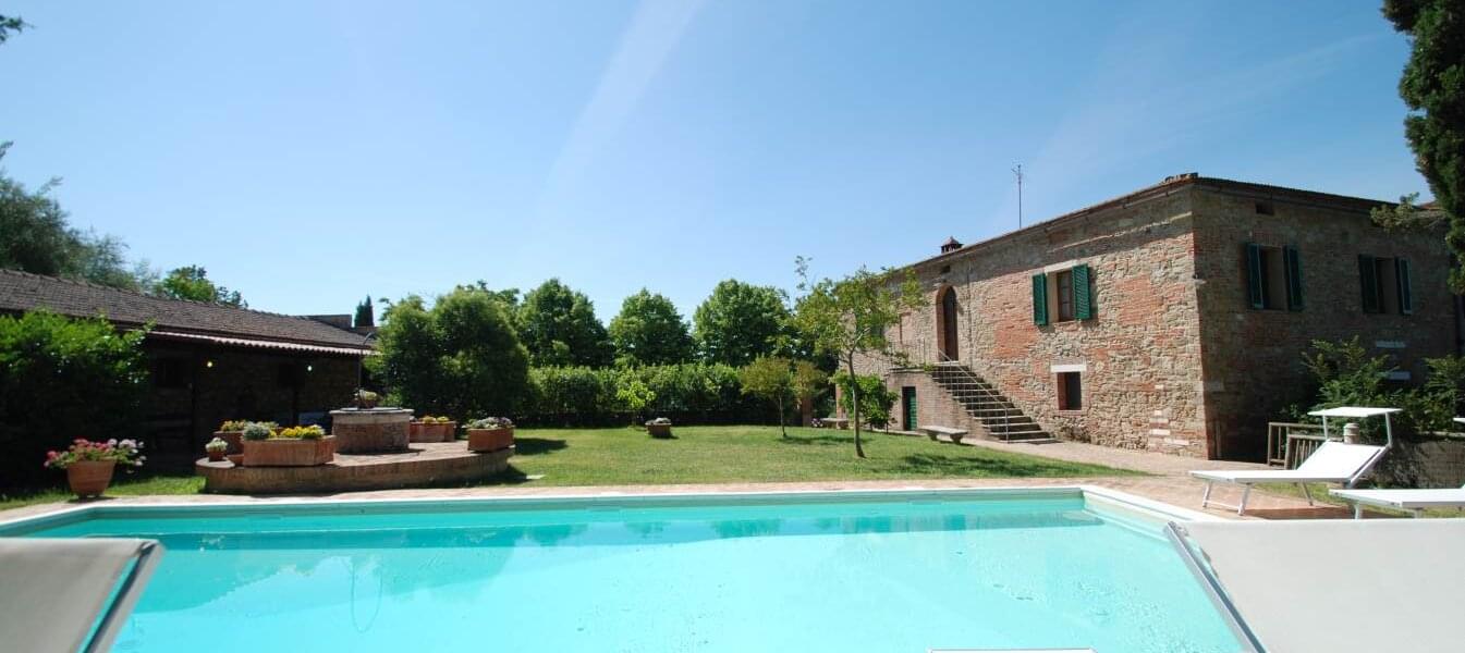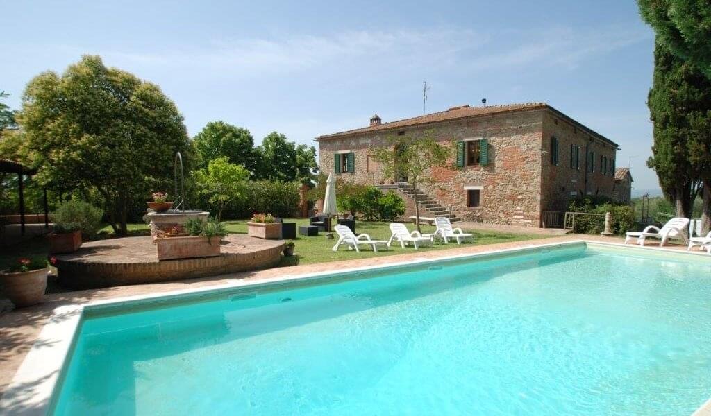 Villa Panorama is a traditional Tuscan country house rental situated in the beautiful area known as \"Le Crete Senesi\" south of Siena, with breathtaking views over the rolling hills. Part of a working farm, the main product today is cereal. This independent farmhouse was recently restored ensuring that it remains true to its Tuscan origins and fully preserving its important rural history. Therefore it has a large well equipped kitchen with a massive fireplace which still remains the focal point of the house. High beamed ceilings and a mixture of traditional, elegant, and modern furniture give it the comfort and charm you\'re looking for. The spacious living/dining room next to the kitchen gives a large gathering place, and there is a study/reading room besides. Four of the five bedrooms have ensuite bathrooms with shower. The large fifth bathroom is at the end of a wide corridor. The private Italian garden is furnished with table and chairs for al fresco dinners as well as a nice swimming pool for your exclusive use. The beautiful village of Asciano is only 7 kms and offers restaurants, shops, supermarket, and banks. Siena is a near 24 kms.