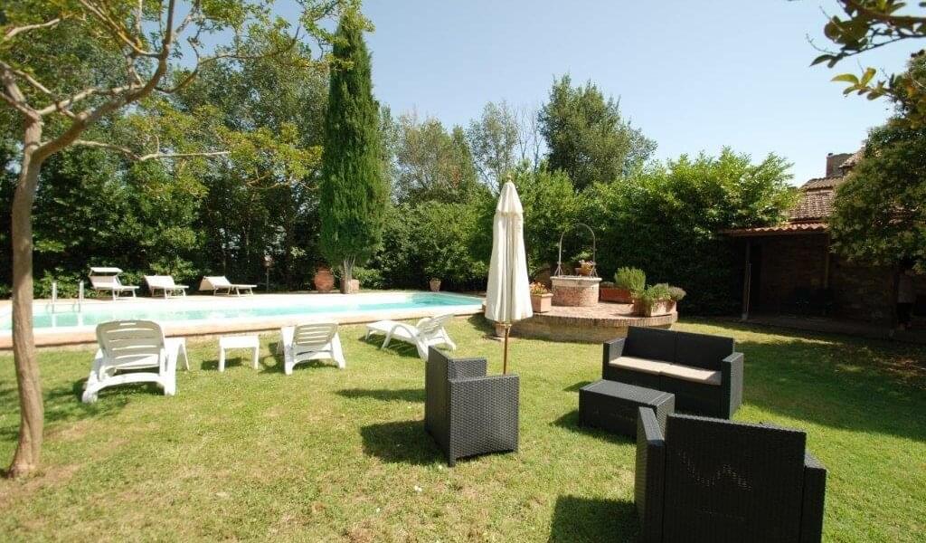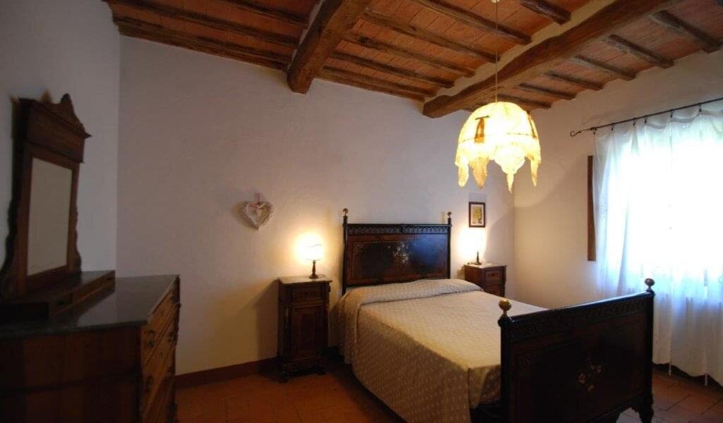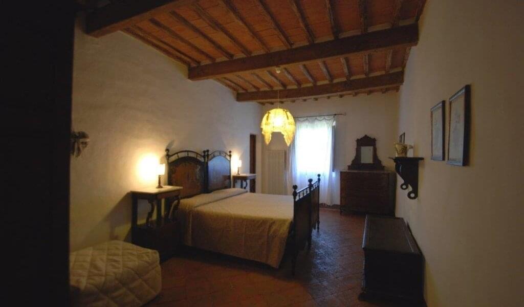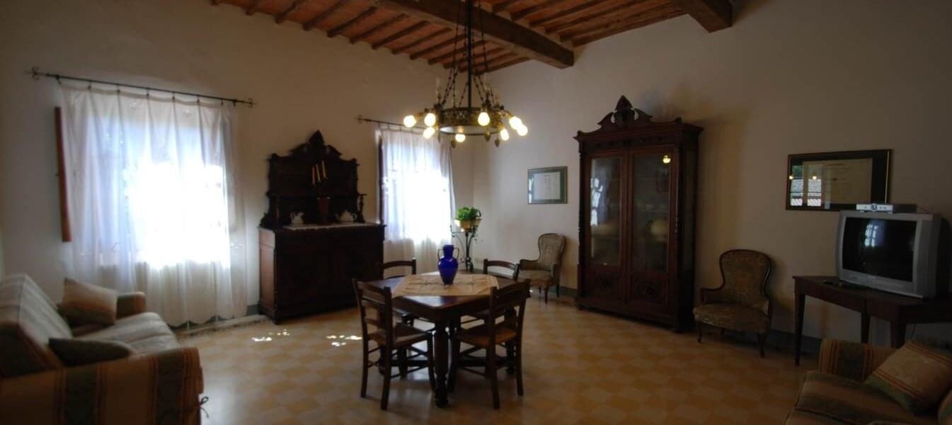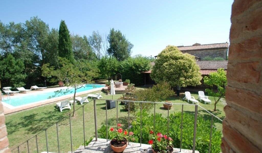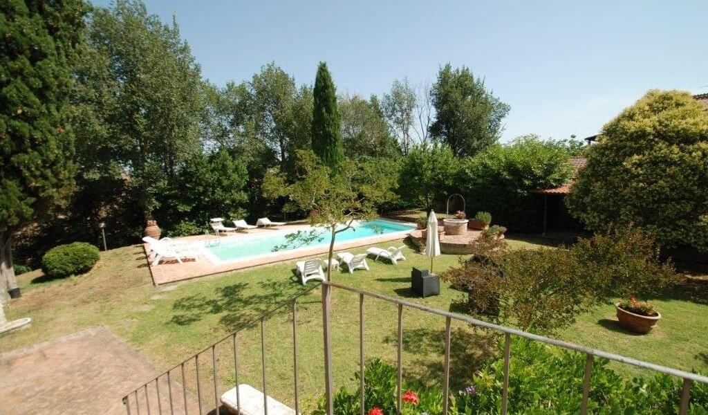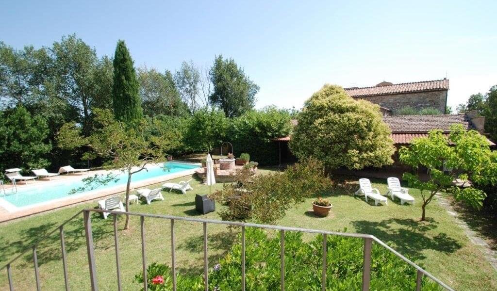 Villa Panorama is a simple yet comfortable country farmhouse on a working estate in central Tuscany. This traditional stone house has the main living area on the second floor, approached by a classic double marble stircase. Recently renovated, it has been preserved in style to offer a truly Tuscan experience. The large, well equipped kitchen has a massive fireplace. The living/dining room has plenty of seating and offers television. In front of the kitchen is a small study/reading room. Of the 5 bedrooms, 3 of them have queen size beds ensuite bathrooms with shower, 1 has two twin beds with ensuite bathtroom with shower, and the 5th one has two twin beds which has a large bathroom with shower at the end of the wide corridor leading to the rooms. The main floor has a laundry room with iron and ironing board. A wrought iron gate leads to the private Italian style garden, furnished with table and chairs for al fresco dinners. Also in the garden is a swimming pool for the exclusive use of guests.