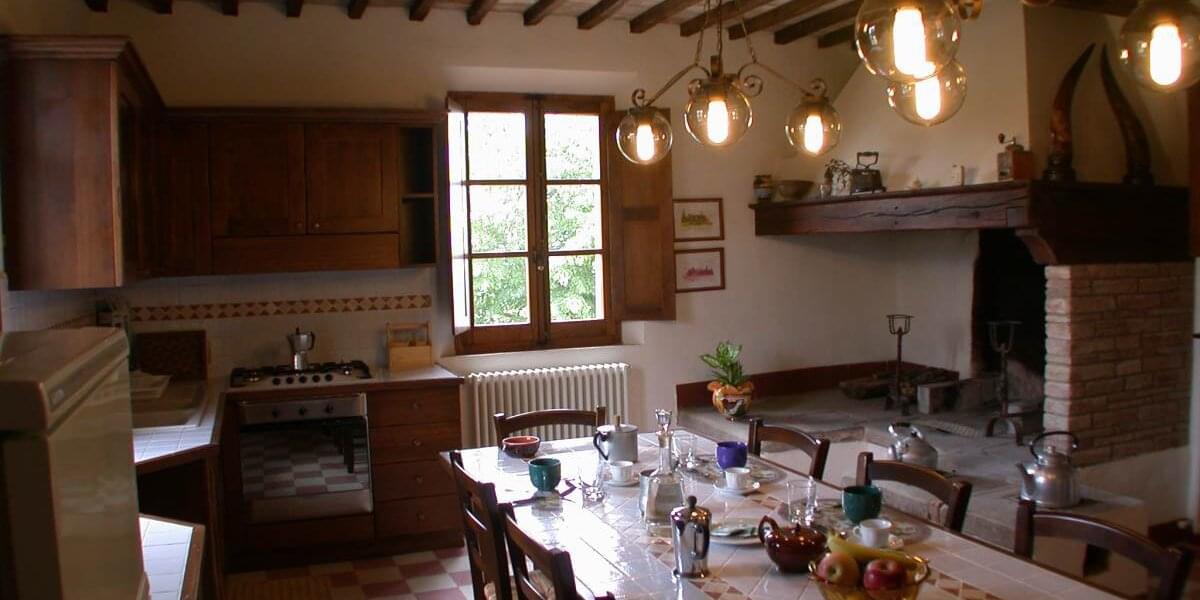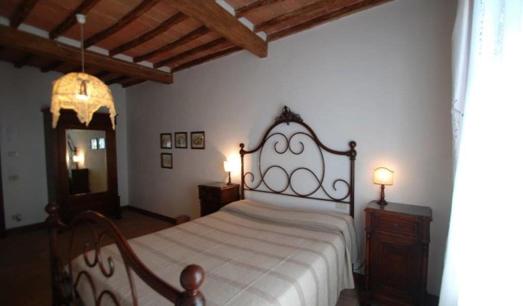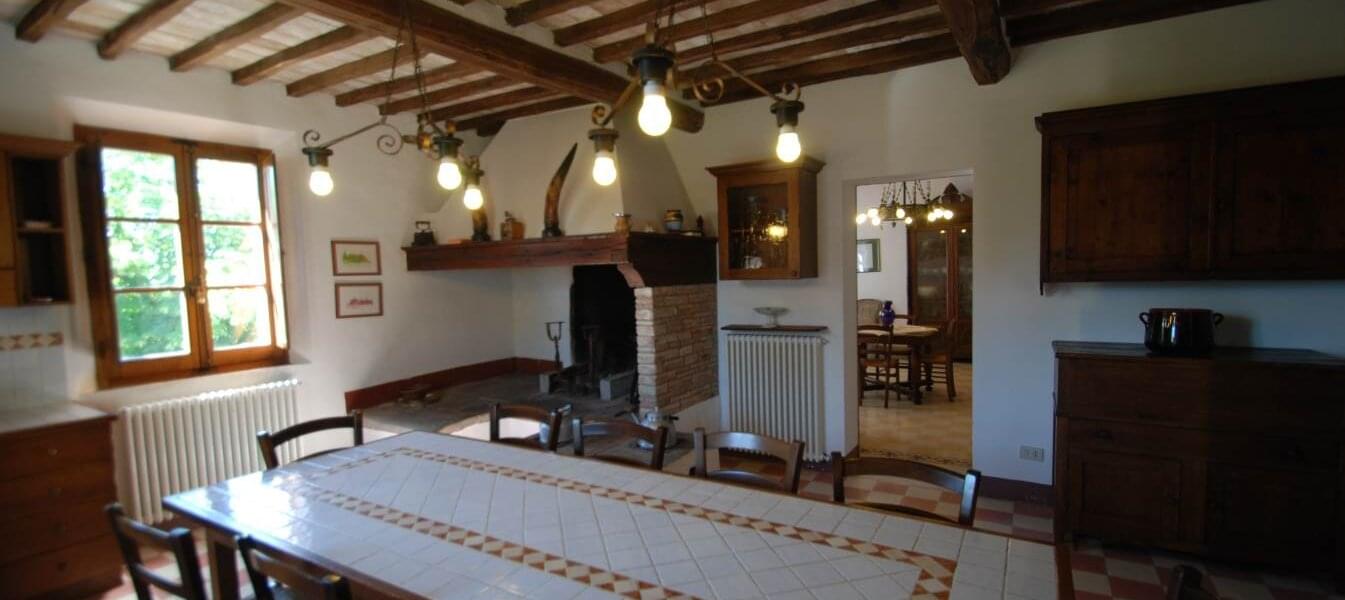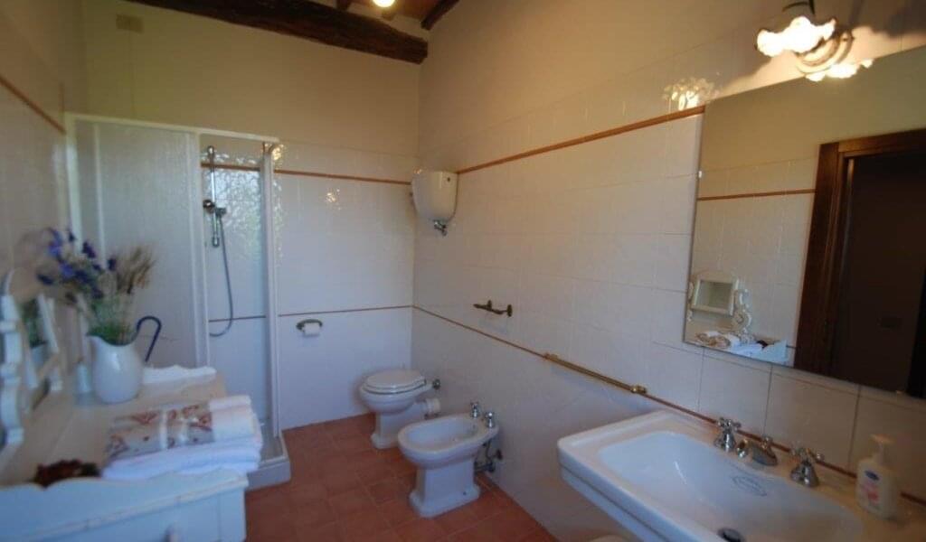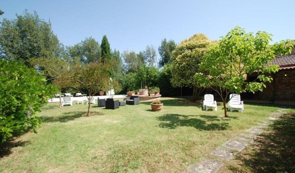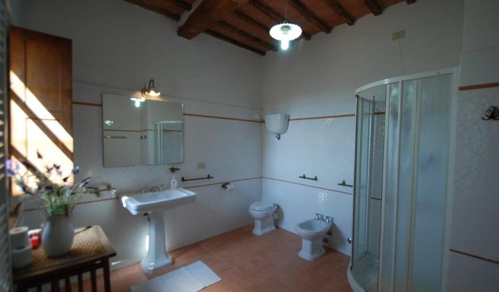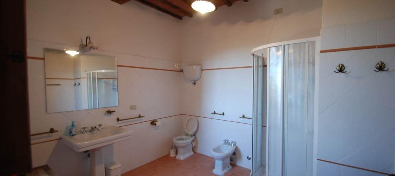 Villa Panorama is a simple yet comfortable country farmhouse on a working estate in central Tuscany. This traditional stone house has the main living area on the second floor, approached by a classic double marble stircase. Recently renovated, it has been preserved in style to offer a truly Tuscan experience. The large, well equipped kitchen has a massive fireplace. The living/dining room has plenty of seating and offers television. In front of the kitchen is a small study/reading room. Of the 5 bedrooms, 3 of them have queen size beds ensuite bathrooms with shower, 1 has two twin beds with ensuite bathtroom with shower, and the 5th one has two twin beds which has a large bathroom with shower at the end of the wide corridor leading to the rooms. The main floor has a laundry room with iron and ironing board. A wrought iron gate leads to the private Italian style garden, furnished with table and chairs for al fresco dinners. Also in the garden is a swimming pool for the exclusive use of guests.