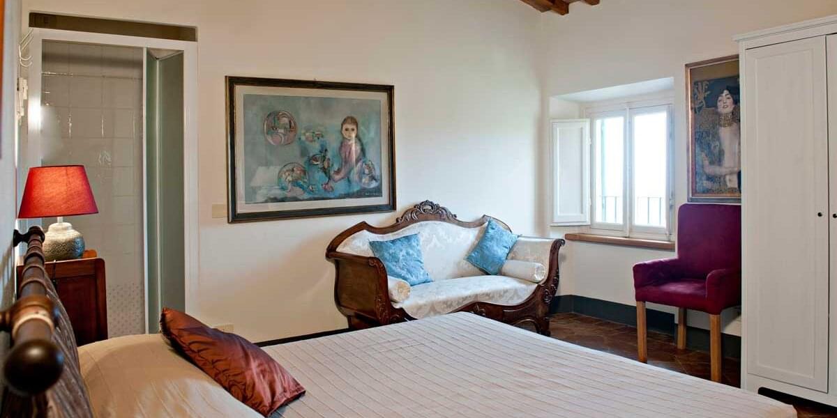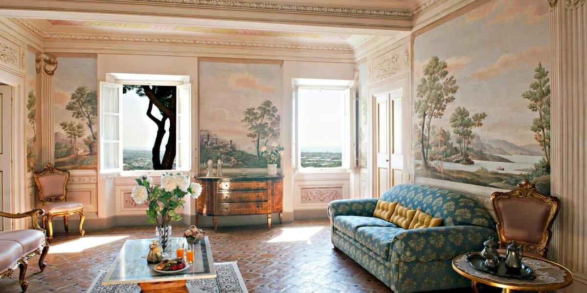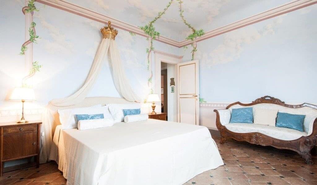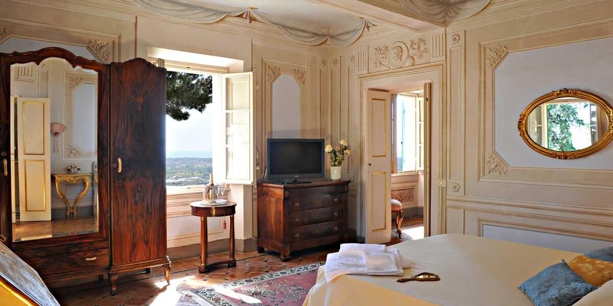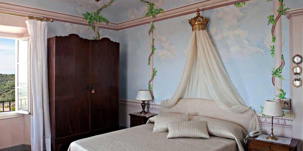 #2 Deluxe frescoed bedroom (30 sqm, 2 people) with impressive panoramic view of the sea, the hills and the garden. Double bed, ensuite bathroom, with spacious shower, finished in fine Italian marble. Surface: about 30 sqm; WIFI; Satellite TV.