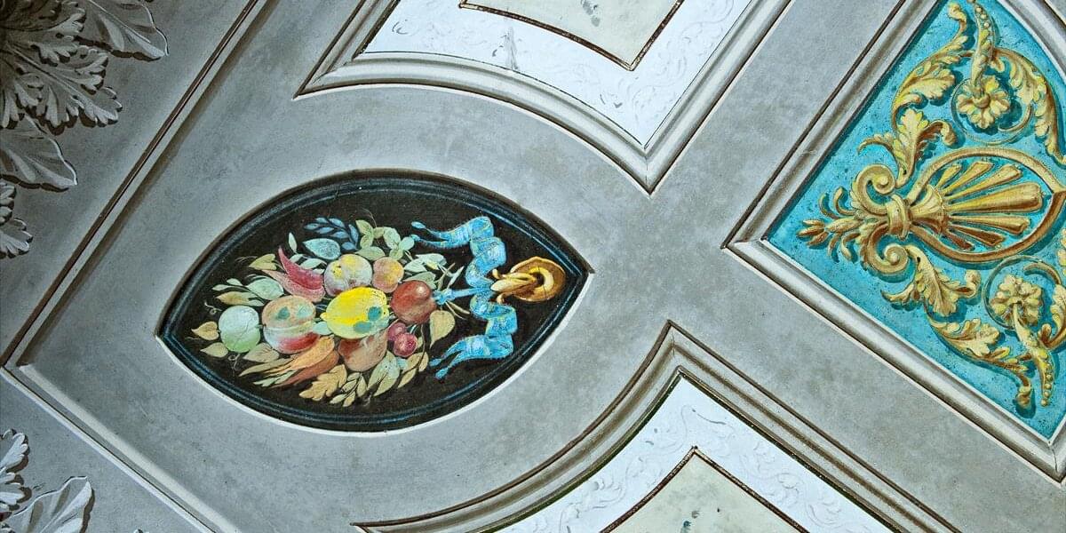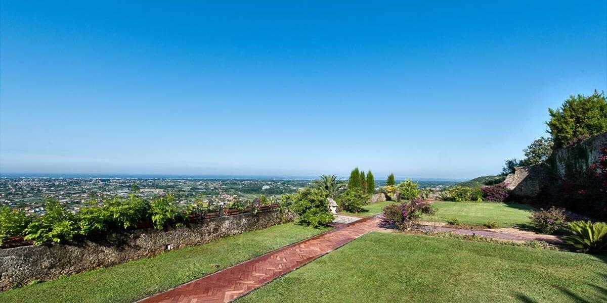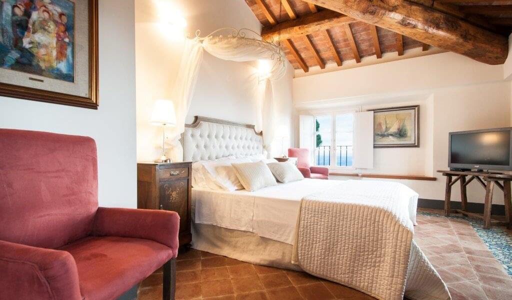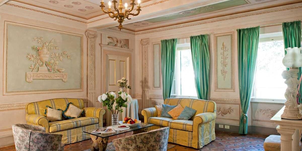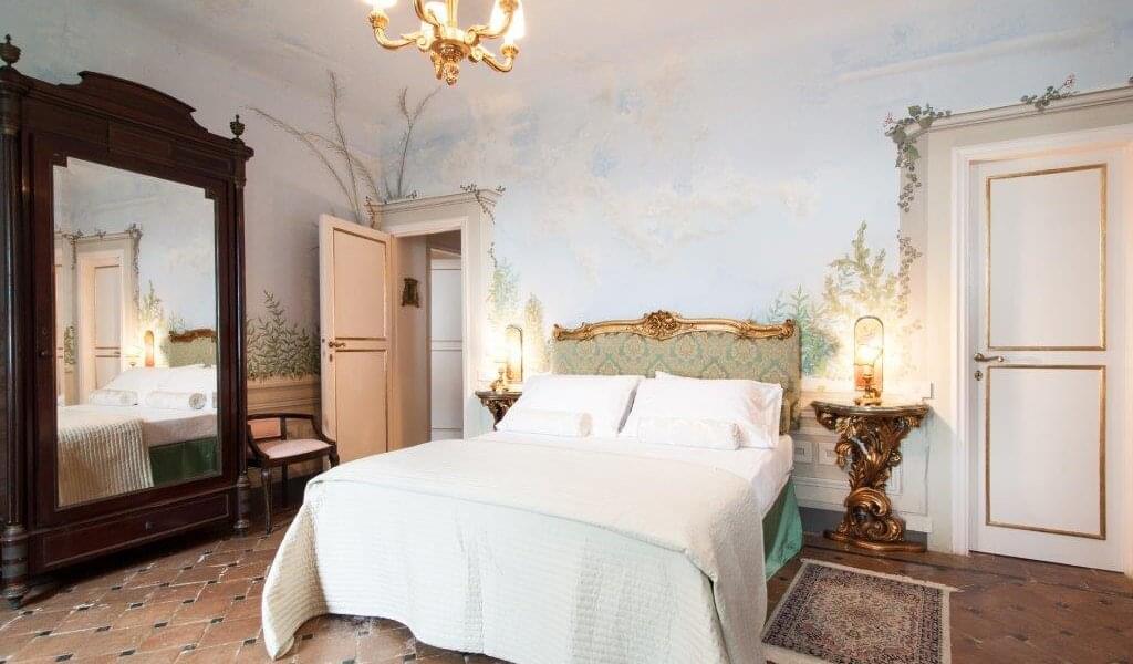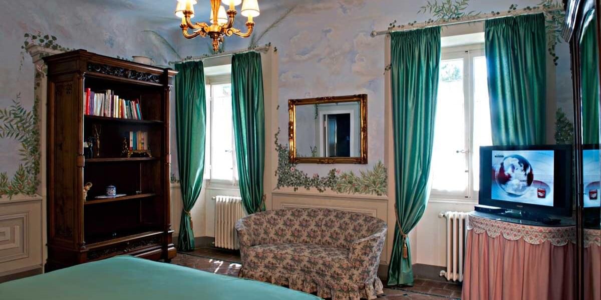 #2 Deluxe frescoed bedroom (30 sqm, 2 people) with impressive panoramic view of the sea, the hills and the garden. Double bed, ensuite bathroom, with spacious shower, finished in fine Italian marble. Surface: about 30 sqm; WIFI; Satellite TV.