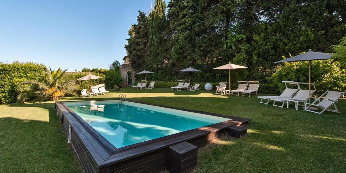 The swimming pool, with sun beds and umbrellas, is located in a panoramic area in the center of the gardens behind the villa.