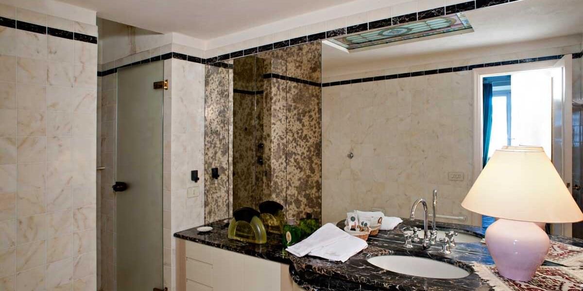 #3 Deluxe frescoed bedroom (30 sqm, 2 people) with impressive panoramic view of the sea, the hills and the garden. Double bed ensuite bathroom, with spacious shower, finished in fine Italian marble. Surface: about 30 sqm; WIFI; Satellite TV; Game room.