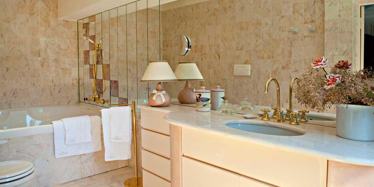 #1 “Sant’Andrea” Suite (70 sqm, 2 people) consists of a bedroom and a lounge with sofas. The frescoed suite offers a view over the sea, the hills and the garden and is furnished with antique. The large bathroom, finished with Italian marble, has a relaxing round Jacuzzi for two; WIFI; Satellite TV.